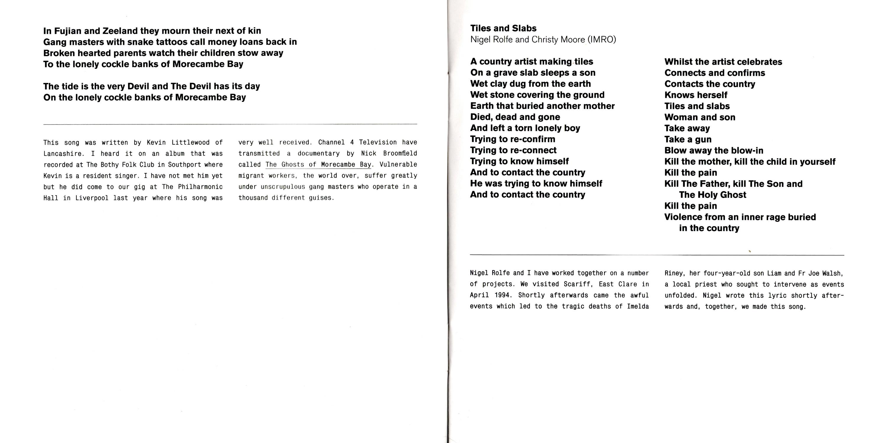 Tiles and Slabs — Nigel Rolfe and I have worked together on a number of projects. We visited Scariff, East Clare in April 1994. shortly afterwards came the awful events which led to the tragic deaths of Imelda Riney. her four-year-old son Liam and Fr Joe Walsh a local priest who sought to Intervene as events unfolded. Nigel wrote this lyric shortly afterwards and, together, we made this song.