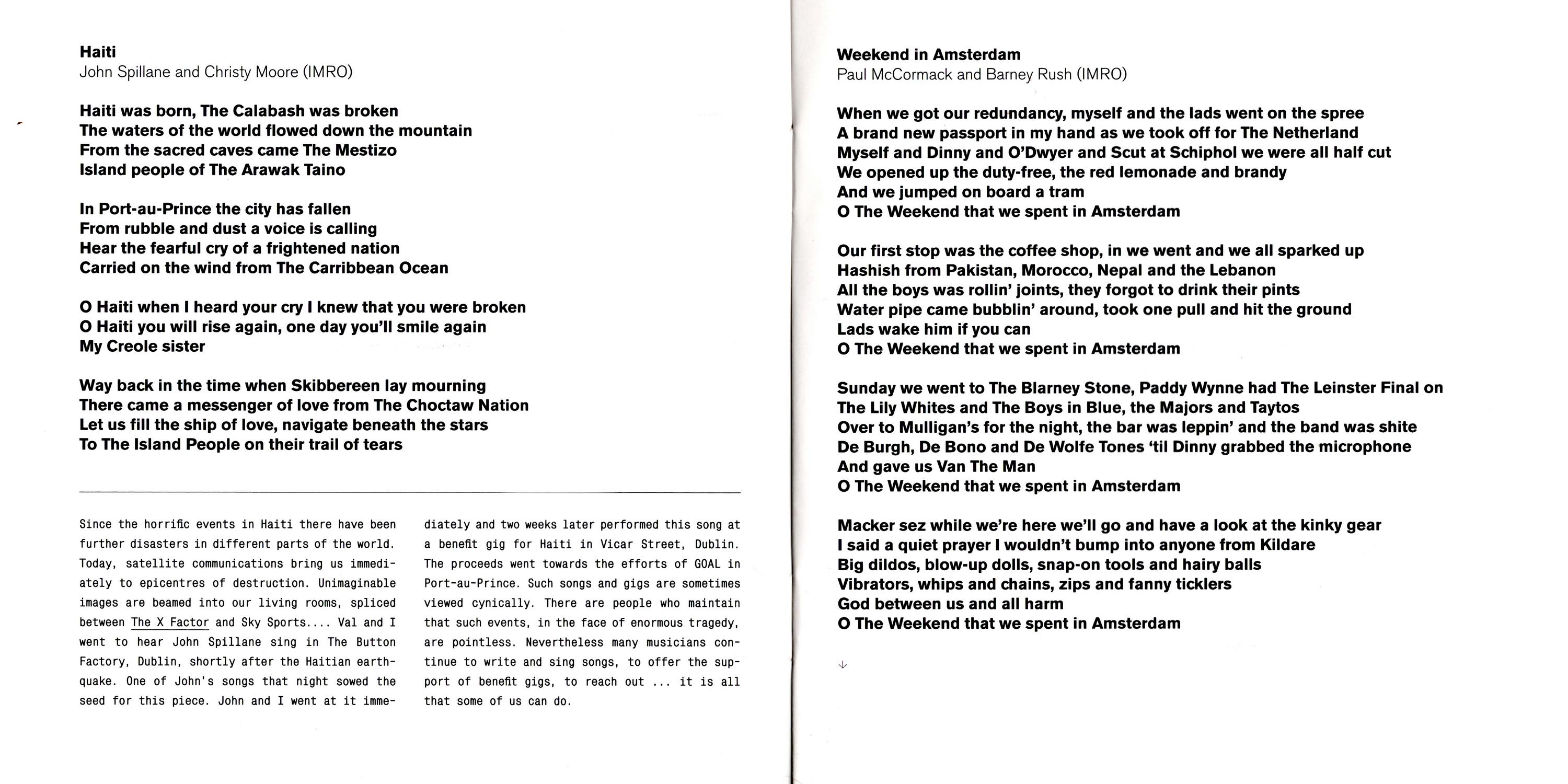 Haiti — Since the horrific events In Haiti there have been further disasters in different parts of the world. Today, satellite communicatlons bring us immediately to epicentres of destruction. Unimaginable images are beamed into our living rooms, spliced between The X Factor and Sky Sports … Val and I went to hear John Spillane sing In The Button Factory. Dublin, shortly after the Haitian earthquake. One of John's songs that night sowed the seed for this piece. John and I went at immediately and two weeks later performed this song at a benefit gig for Haiti In Vicar Street. Dublin. The proceeds went towards the efforts of GOAL in Port-au-Prince. Such songs and gigs are sometimes viewed cynically, There are people who maintain that such events, in the face of enormouas tragedy are pointless. Nevertheless many musicians continue to write and sing songs, to offer the support of benefit gigs, to reach out … it is all that some or us can do.