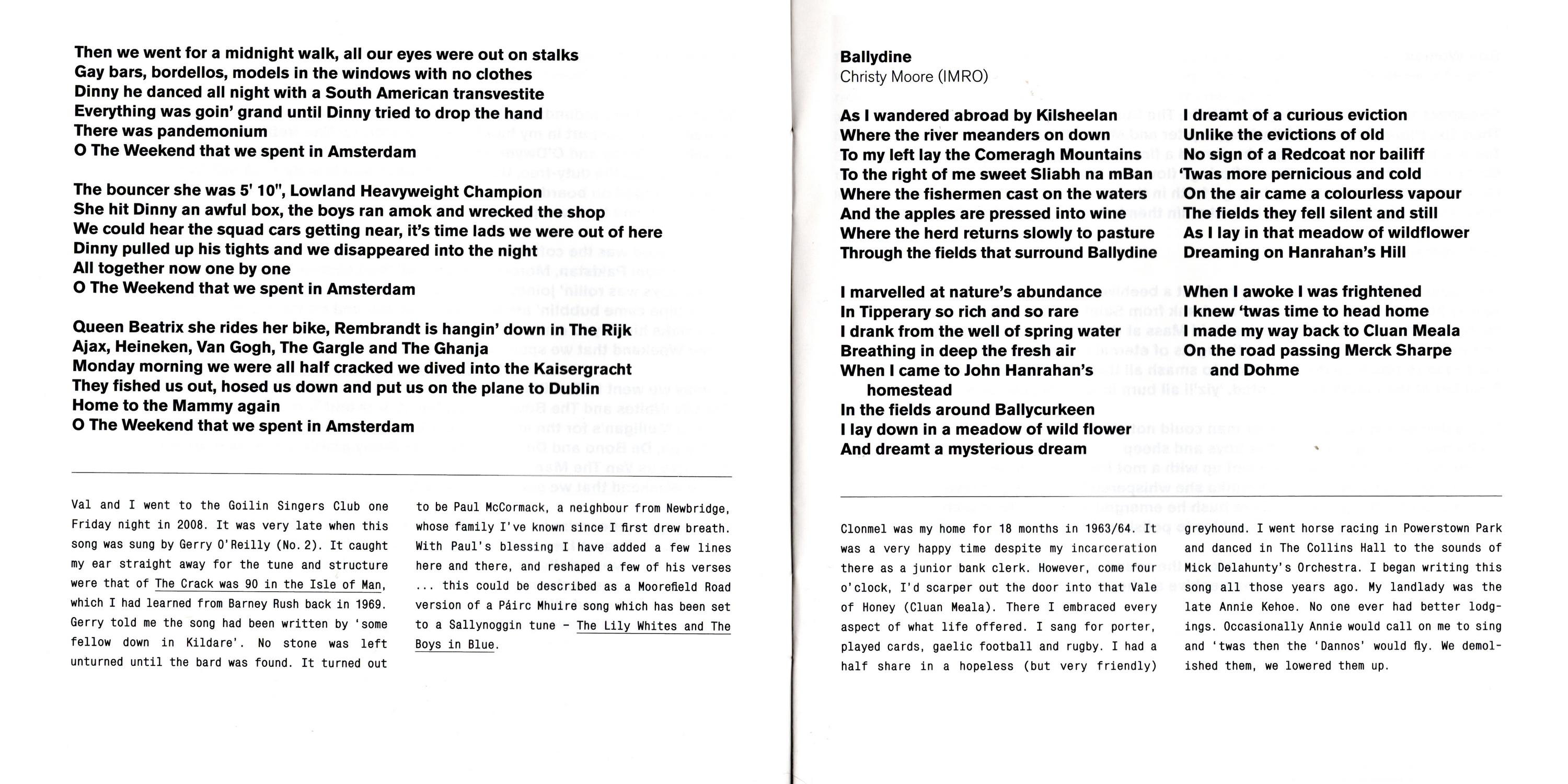 Weekend in Amsterdam — Val and I went to the Goilin Singers Club on Friday night in 2008. It was vary late when this song was sung by Gerry O'Reilly (No. 2). It caught my ear straight away fo the tune and structure were of The Crack was 90 in the Isle of Man which I had learned from Barney Rush back in 1969. Gerry told me the song had been written by 'some fellow down In Kildare'. No stone was left unturned until the bard was found, It turns out to be Paul McCormack, a neighbour from Newbridge, whoes family I've since I first drew breath With Paul's blessing I have added a few lines here and there, and reshaped a few of his verses … this could described as a Moorefield Road version of a Pairc Mhuire song which has been set to a Sallynoggin tune — The Lily Whites and The Boys in Blue.