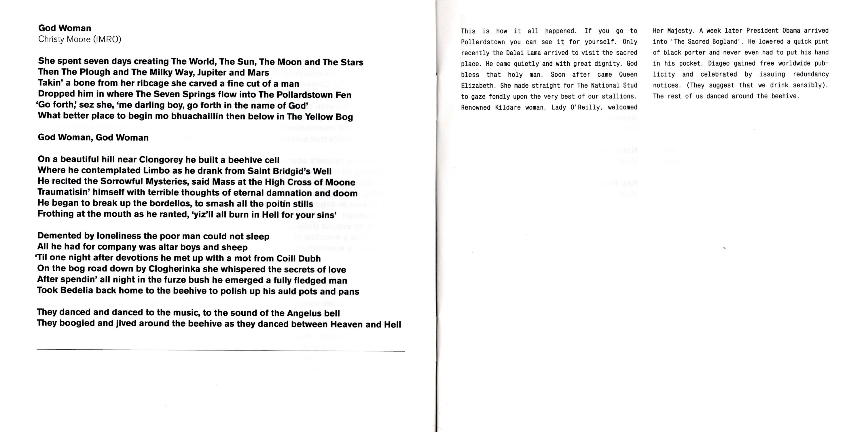 God Woman — This how it all happened. If you go to Pollardstown you can see it for yourself. Only recently the Dalai Lama arrived to visit the sacred place. He came quietly and with great dignity. God bless that holy man. Soon after came Queen Elizabeth. She made straight for The National Stud to gaze fondly upon the very best of our stallions Renowned Kildare woman, Lady O'Reilly, welcomed Her Majesty. A week later President Obama arrived into 'The Sacred Bogland'. He lowered a quick pint of black porter and never even had to put his hand in his pocket. Diageo gained free worldwide publicity and celebrated by issuing redundancy notices. (They suggest that we drink sensibly). The rest of us danced around the beehive.