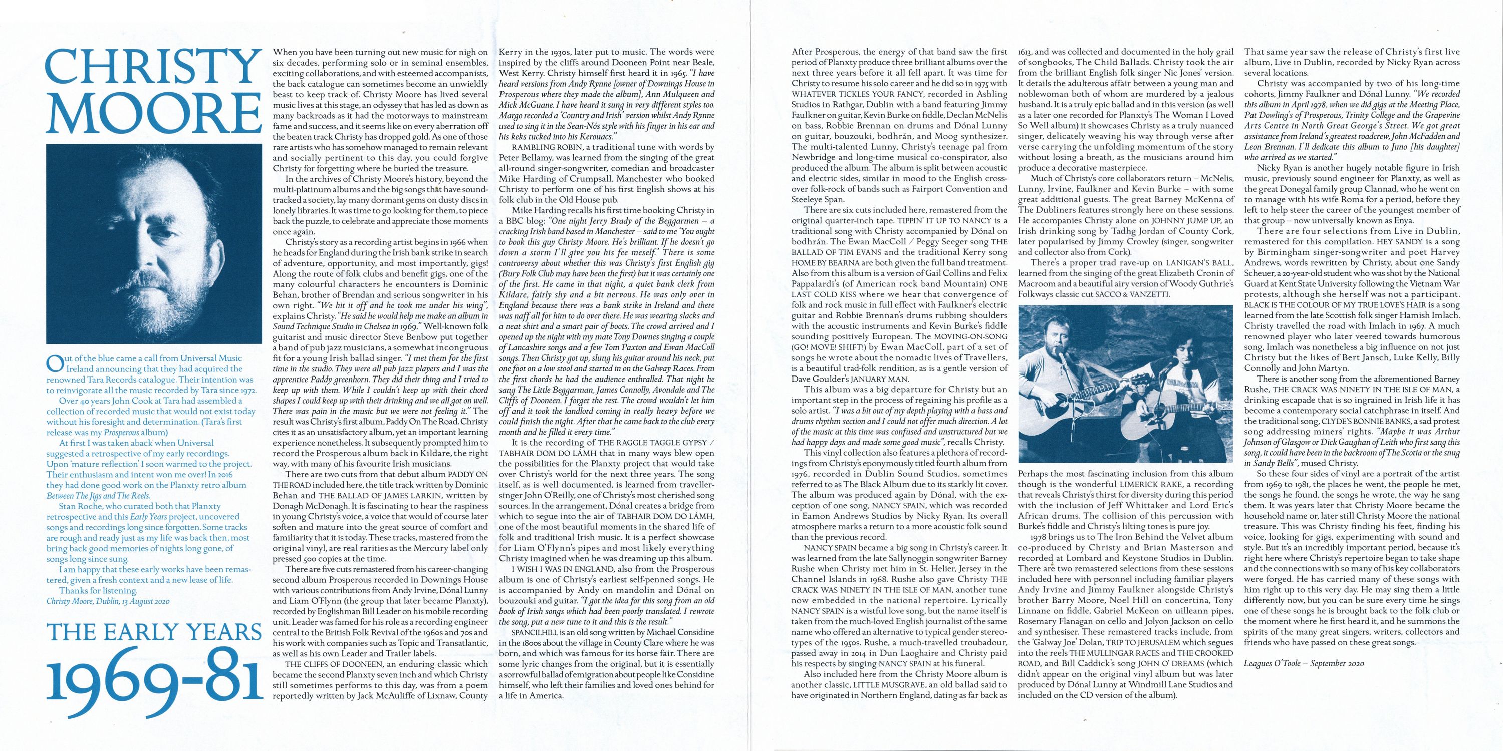 So these four sides of vinyl are a portrait of the artist from 1969 to 1981, the places he went, the people he met, the songs he found, the songs he wrote, the way he sang them. It was years later that Christy Moore became the household name or, later still Christy Moore the national treasure. This was Christy finding his feet, finding his voice, looking for gigs, experimenting with sound and style. But it's an incredibly important period, because it's right here where Christy's repertoire began to take shape and the connections with so many of his key collaborators were forged. He has carried many of these songs with him right up to this very day. He may sing them a little differently now, but you can be sure every time he sings one of these songs he is brought back to the folk club or the moment where he first heard it, and he summons the spirits of the many great singers, writers, collectors and friends who have passed on these great songs.