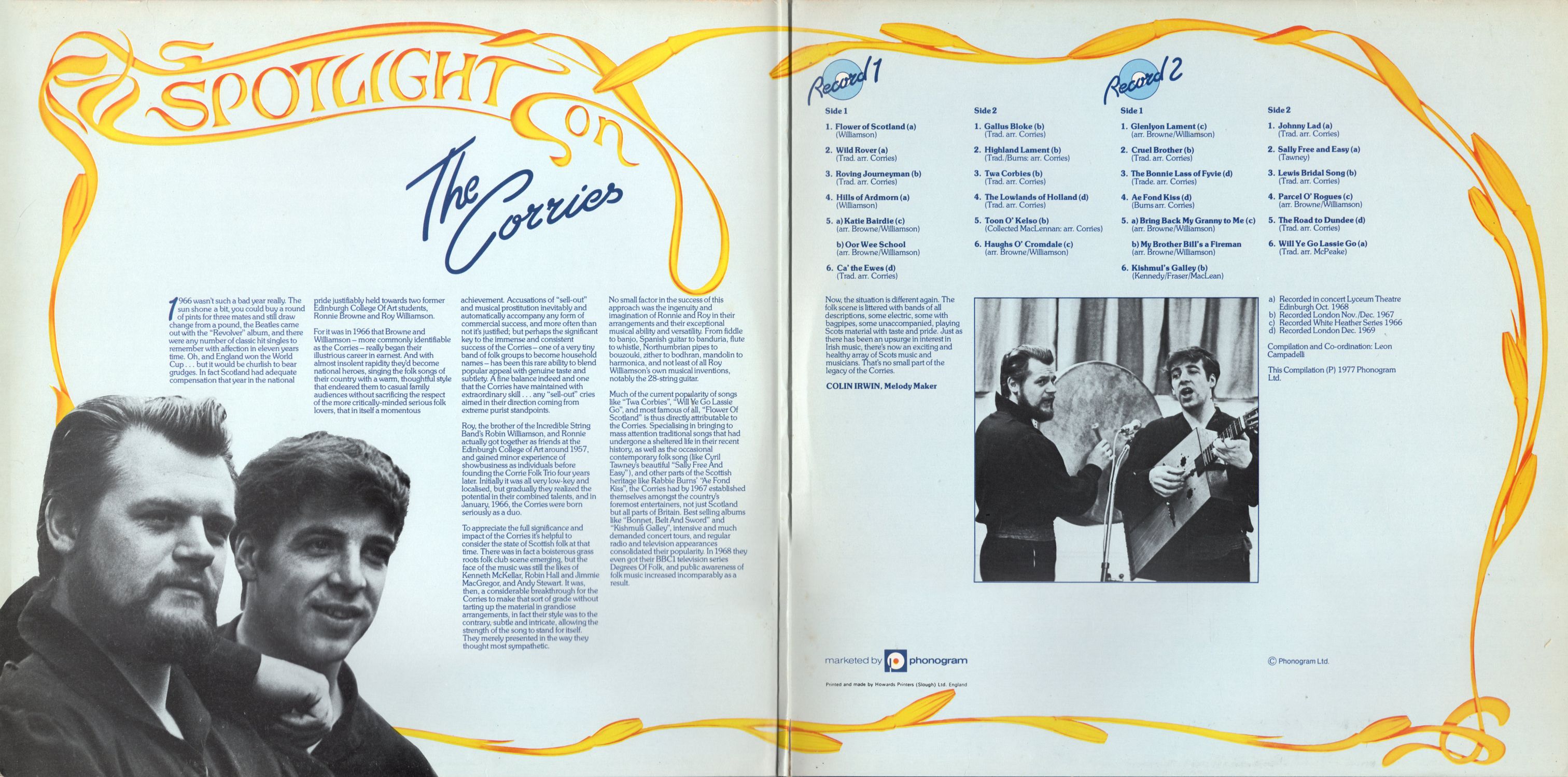 Roy, the brother of the Incredible String Band's Robin Williamson*, and Ronnie actually got together as friends at the Edinburgh College of Art around 1957, and gained minor experience of showbusiness as individuals before founding the Corrie Folk Trio four years later. Initially it was all very low-key and localised, but gradually they realized the potential in their combined talents, and in January, 1966, the Corries were born seriously as a duo.
