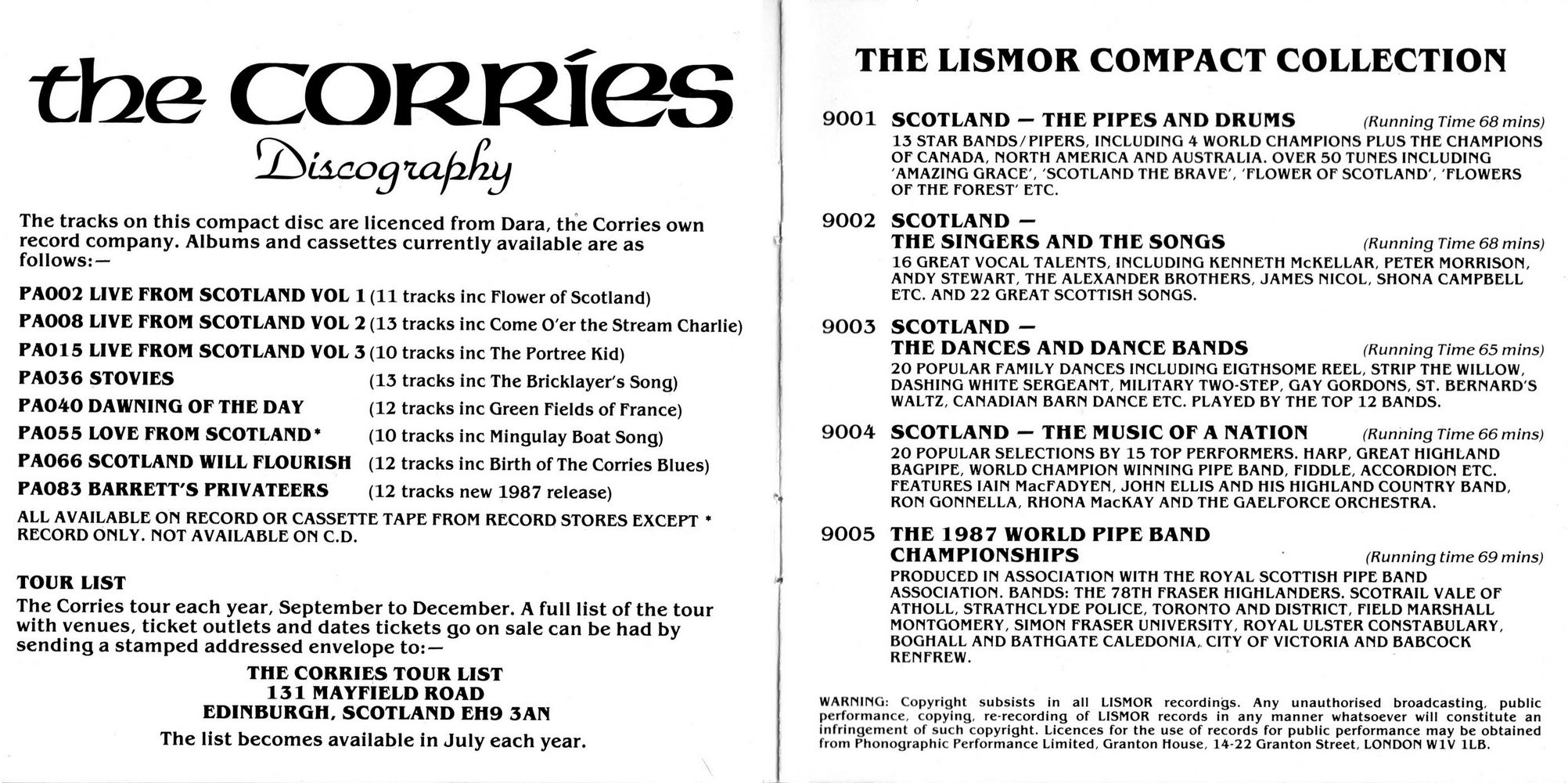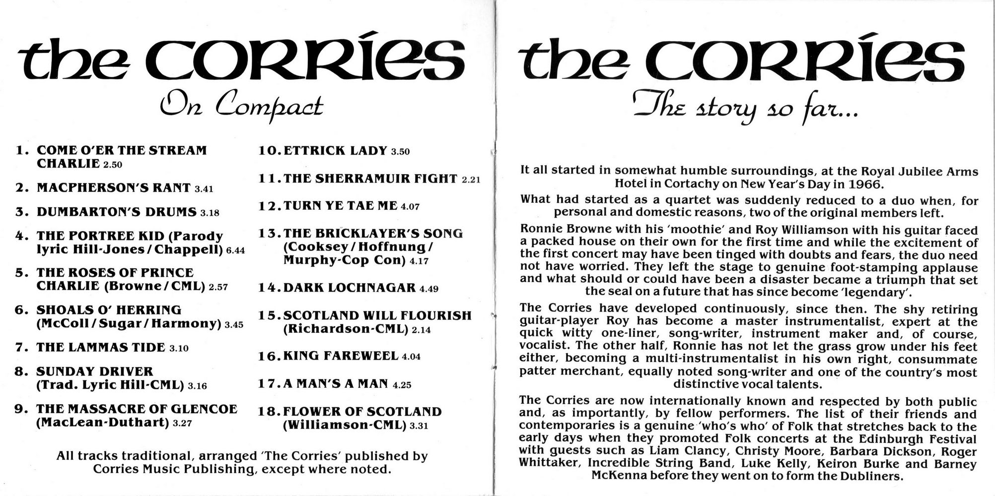 It is hoped that from these tracks you will see where The Corries are coming from. What they have done and where they are going to is in the first part well documented and for the latter part really anyone's guess. (Even with this release, Ronnie and Roy create a wee bit of history by becoming the first Scottish Folk group to release a CD.)