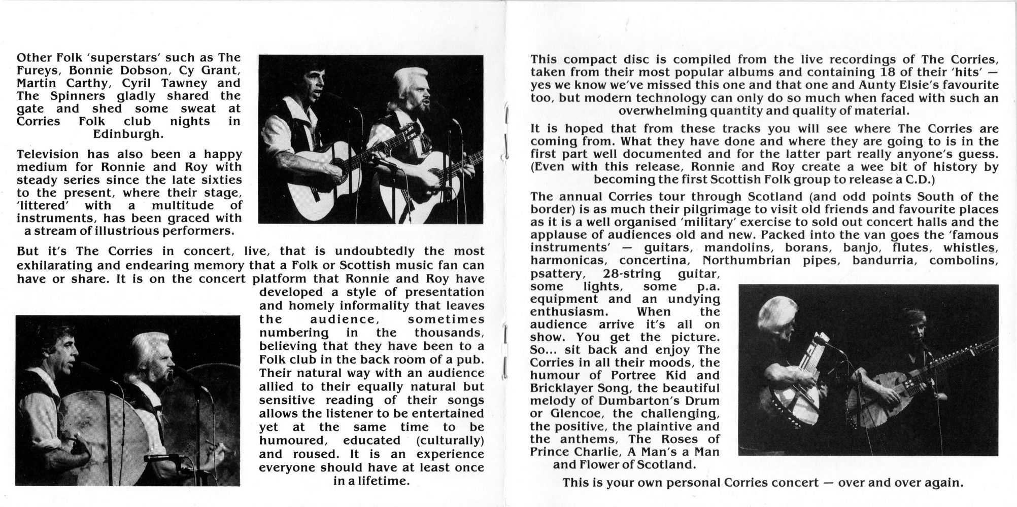 But it's The Corries in concert, live, that is undoubtedly the most exhilarating and endearing memory that a Folk or Scottish music fan can have or share. It is on the concert platform that Ronnie and Roy have developed a style of presentation and homely informality that leaves the audience, sometimes numbering in the thousands, believing that they have been to a Folk club in the back room of a pub. Their natural way with an audience allied to their equally natural but sensitive reading of their songs allows the listener to be entertained yet at the same time to be humoured, educated (culturally) and roused. It is an experience everyone should have at least once in a lifetime.