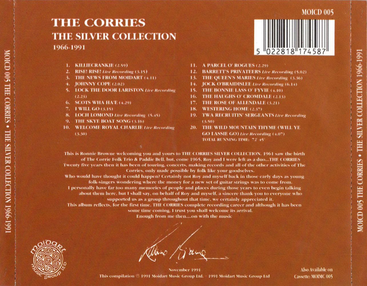 This is Ronnie Browne welcoming you and yours to THE CORRIES SILVER COLLECTION. 1961 saw the birth of The Corrie Folk Trio & Paddie Bell, but, come 1965, Roy and I were left as a duo … THE CORRIES. Twenty five years then it has been of touring, concerts, making records and all of the other activities of The Corries, only made possible by folk like your goodselves.