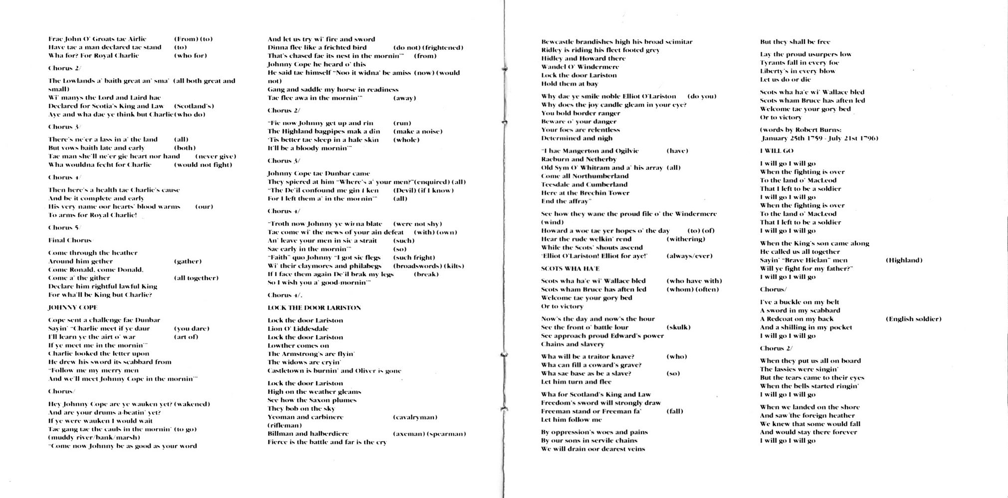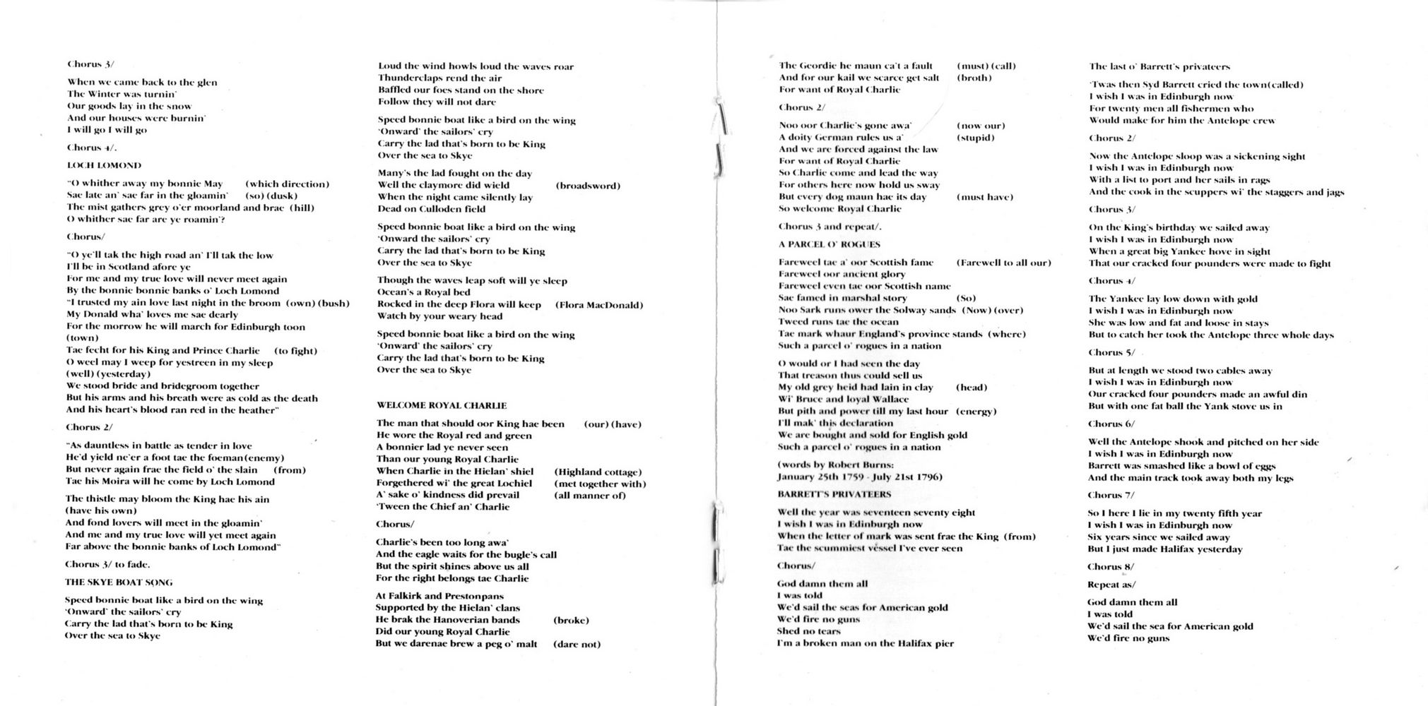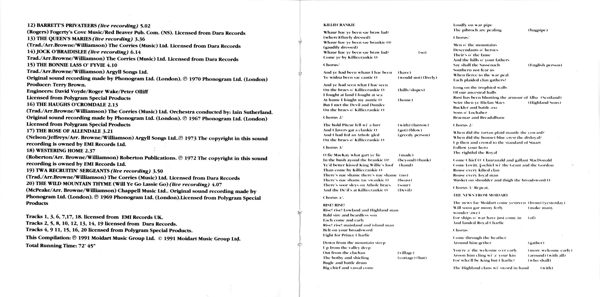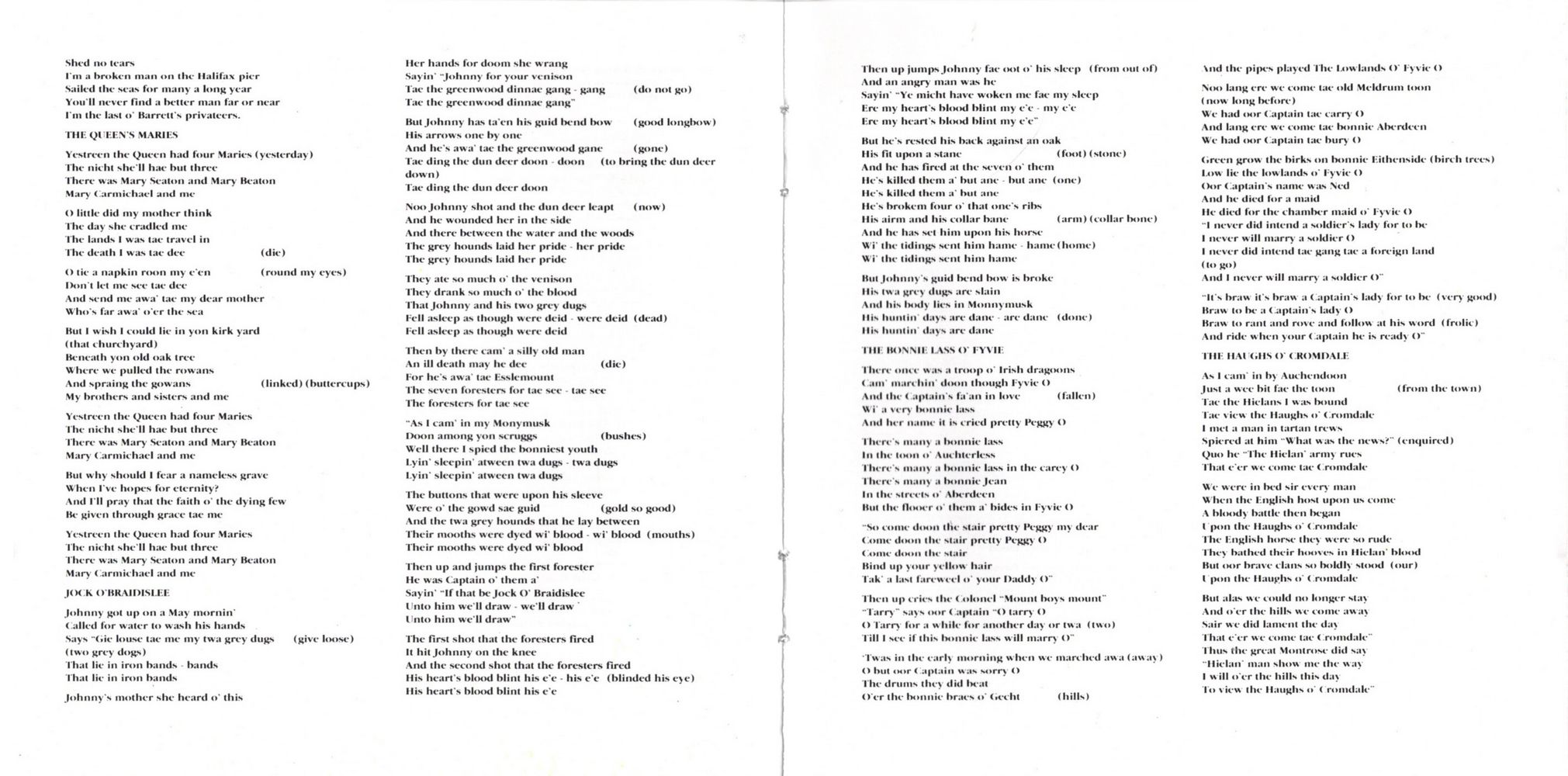 This festival of Corrie music — for as such many of their arrangements came to be recognised — is a distillation, the very essence, of their popular appeal. Some of the songs, like the irresistibly rousing Lock The Door Lariston, go back beyond 1966 to the earliest days of The Corrie Folk Trio and Paddie Bell, but later honed and polished as a thundering duet. There's the smoke of battle in so many of these historic songs — The Braes o' Killiecrankie, Johnny Cope, the majestic Scots Wha Ha'e (to a tune that Scots mercenaries sang as they fought for Joan of Arc), and The Haughs o' Cromdale — thrilling calls to arms for a succession of good and bad causes which stretches from Bannockburn to the Jacobite Risings.