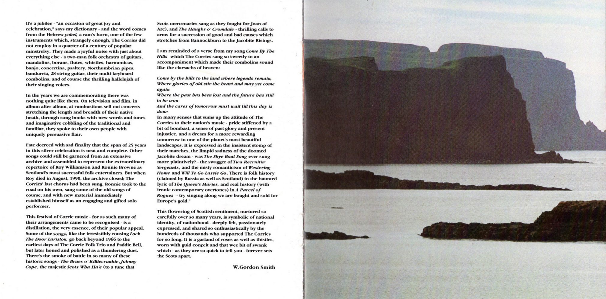 Fate decreed with sad finality that the span of 25 years in this silver celebration is neat and complete. Other songs could still be garnered from an extensive archive and assembled to represent the extraordinary repertoire of Roy Williamson and Ronnie Browne as Scotland's most successful folk entertainers. But when Roy died in August 1990, the archive closed; The Corries' last chorus had been sung. Ronnie took to the road on his own, sang some of the old songs of course, and with new material immediately established himself as an engaging and gifted solo performer.