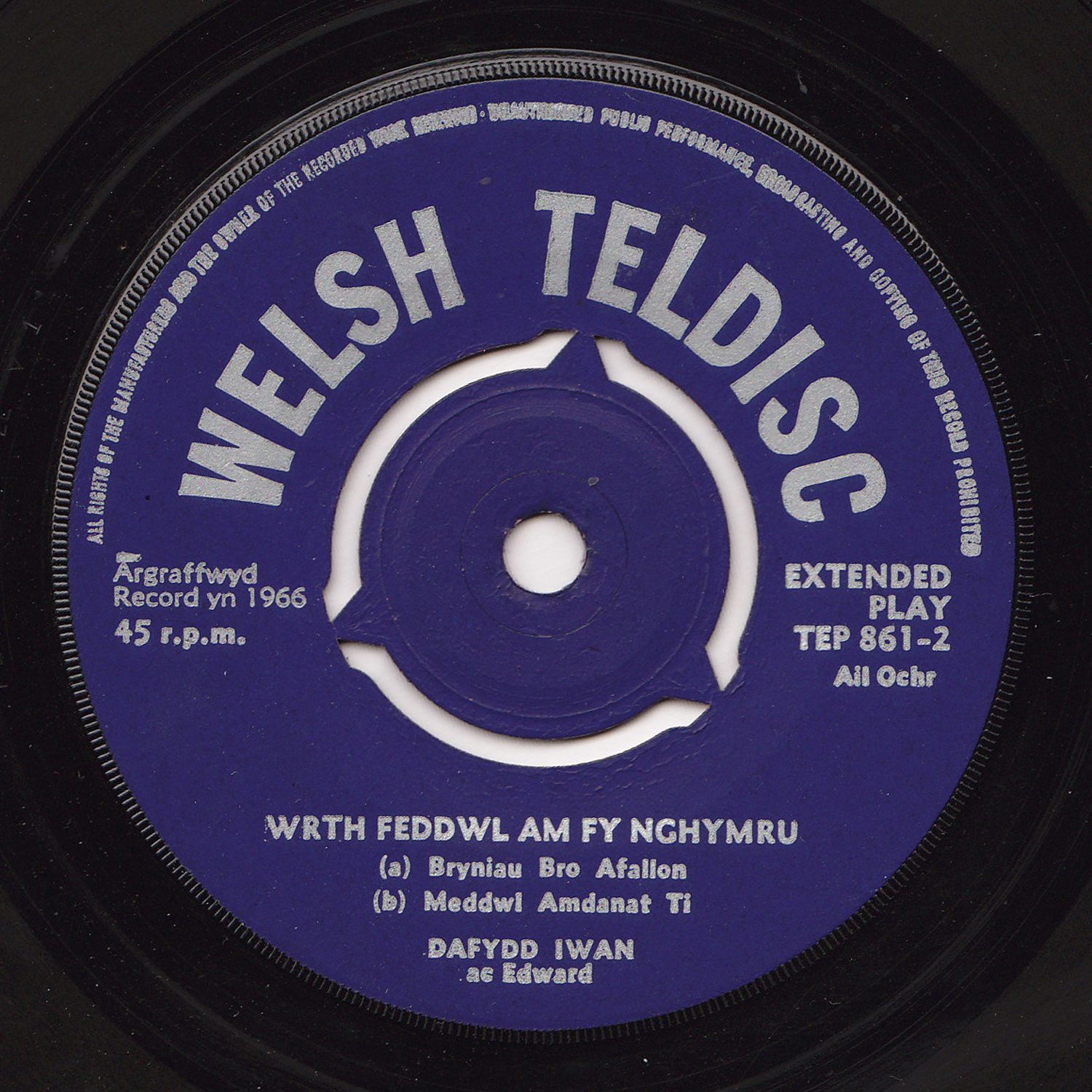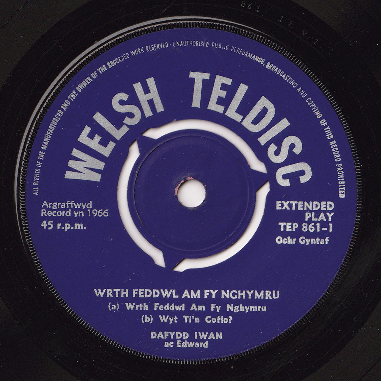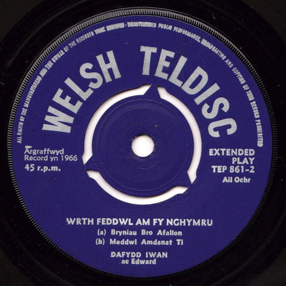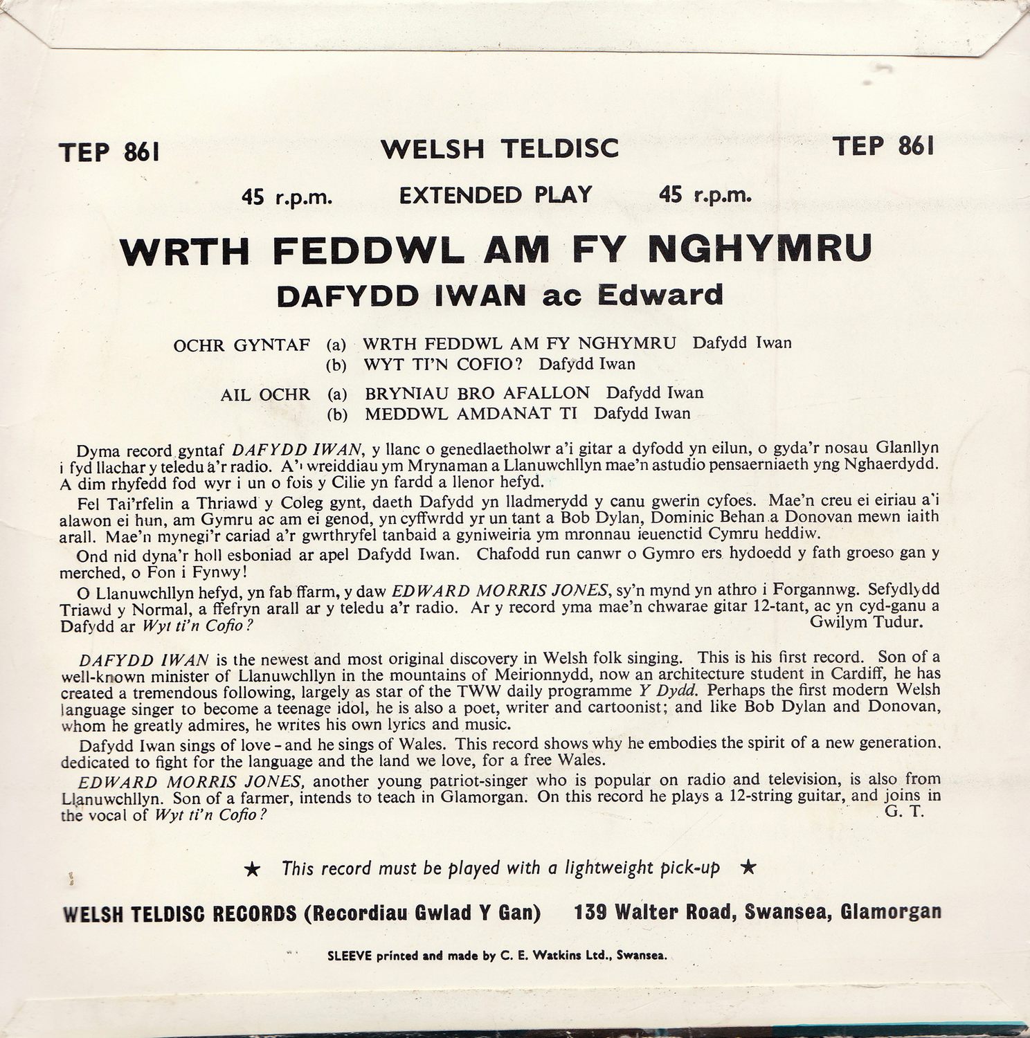 DAFYDD IWAN is the newest and most original discovery in Welsh folk singing. This is his first record. Son of a well-known minister of Llanuwchllyn in the mountains of Meirionnydd, now an architecture student in Cardiff, he has created a tremendous following, largely as star of the TWW daily programme Y Dydd. Perhaps the first modern Welsh language singer to become a teenage idol, he is also a poet, writer and cartoonist; and like Bob Dylan and Donovan, whom he greatly admires, he writes his own lyrics and music.