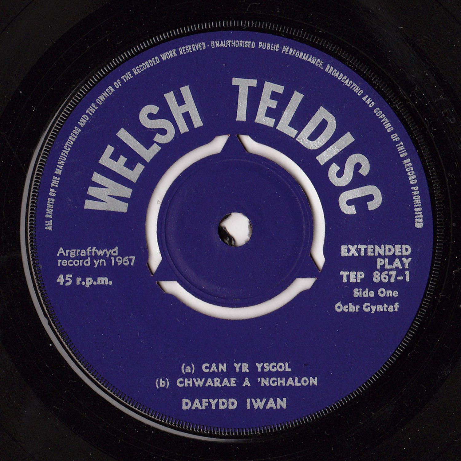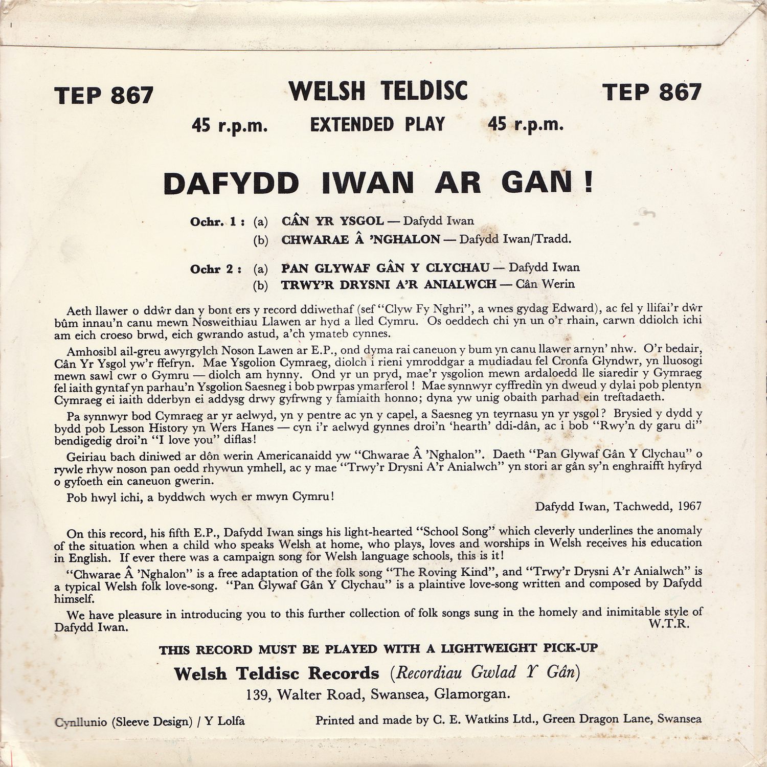 On this record, his fifth E.P., Dafydd Iwan sings his light-hearted "School Song" which cleverly underlines the anomaly of the situation when a child who speaks Welsh at home, who plays, loves and worships in Welsh receives his education in English. If ever there was a campaign song for Welsh language schools, this is it!