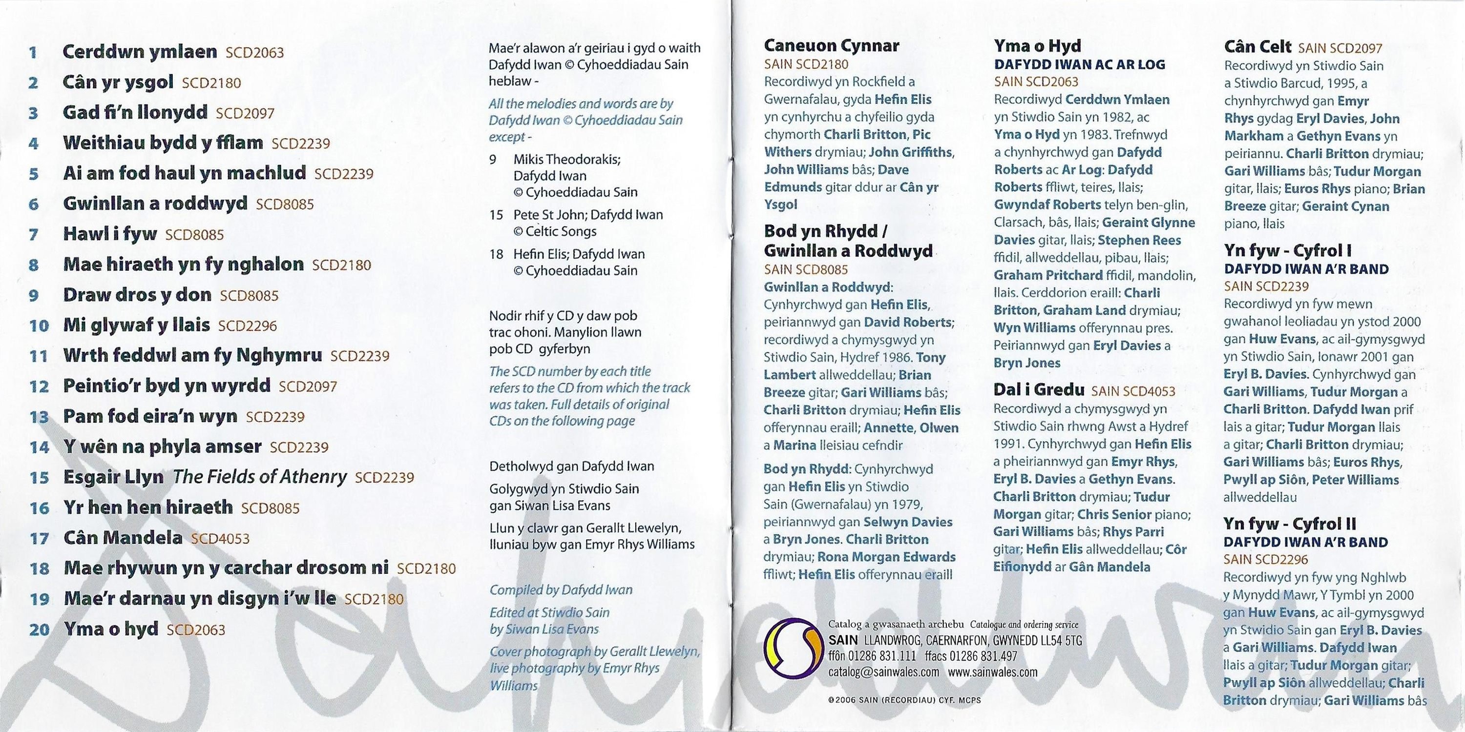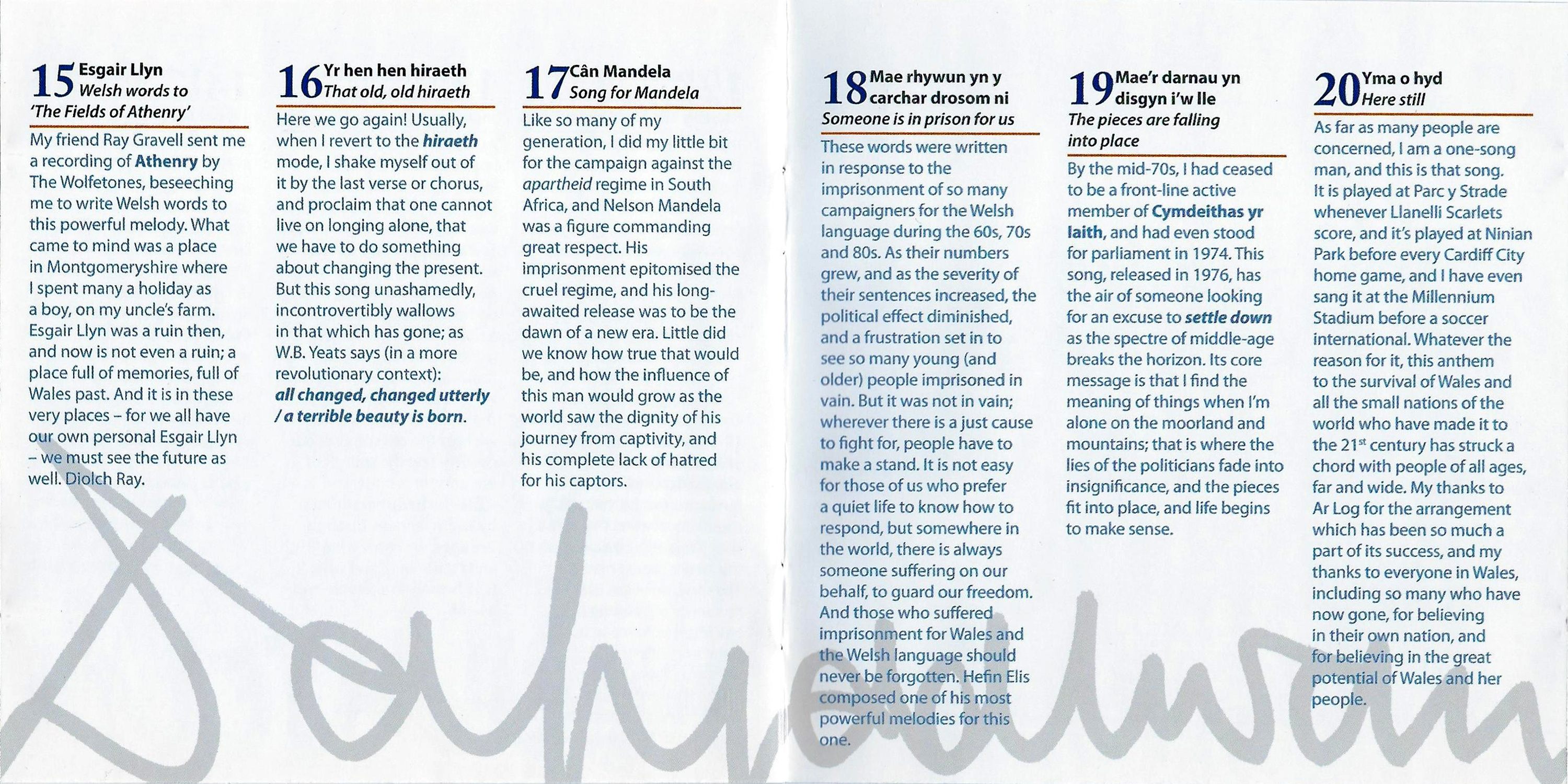 Yma o hyd (Here still) — As far as many people are concerned, I am a one-song man, and this is that song. It is played at Parc y Strade whenever Llanelli Scarlets score, and it's played at Ninian Park before every Cardiff City home game, and I have even sang it at the Millennium Stadium before a soccer international. Whatever the reason for it, this anthem to the survival of Wales and all the small nations of the world who have made it to the 21st century has struck a chord with people of all ages, far and wide. My thanks to Ar Log for the arrangement which has been so much a part of its success, and my thanks to everyone in Wales, including so many who have now gone, for believing in their own nation, and for believing in the great potential of Wales and her people.