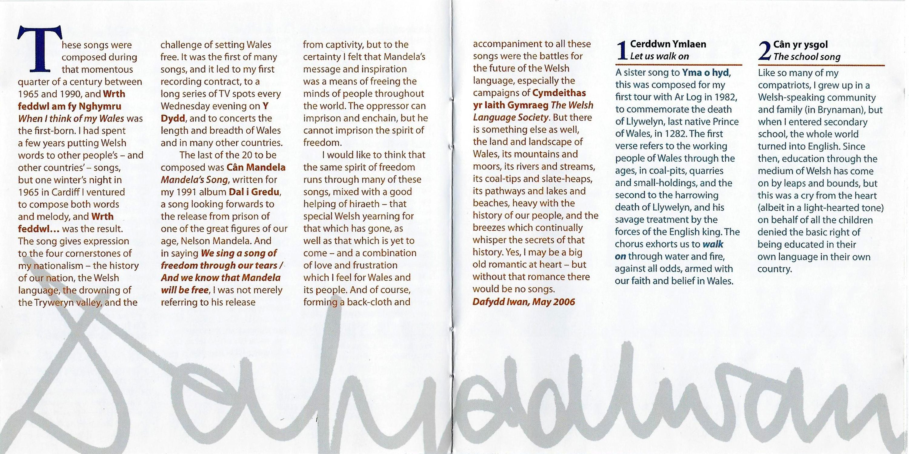 I would like to think that the same spirit of freedom runs through many of these songs, mixed with a good helping of hiraeth — that special Welsh yearning for that which has gone, as well as that which is yet to come — and a combination of love and frustration which I feel for Wales and its people. And of course, forming a back-cloth and accompaniment to all these songs were the battles for the future of the Welsh language, especially the campaigns of Cymdeithas yr laith Gymraeg The Welsh Language Society. But there is something else as well, the land and landscape of Wales, its mountains and moors, its rivers and streams, its coal-tips and slate-heaps, its pathways and lakes and beaches, heavy with the history of our people, and the breezes which continually whisper the secrets of that history. Yes, I may be a big old romantic at heart — but without that romance there would be no songs.