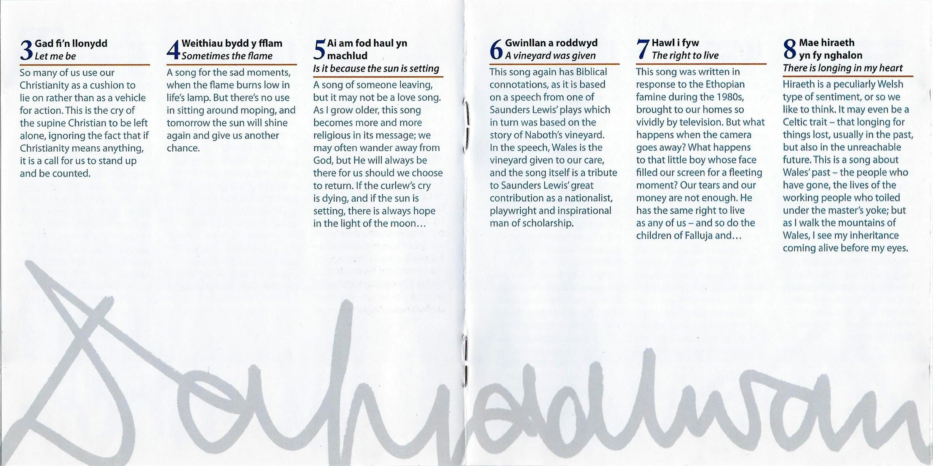Hawl i fyw (The right to live) — This song was written in response to the Ethopian famine during the 1980s, brought to our homes so vividly by television. But what happens when the camera goes away? What happens to that little boy whose face filled our screen for a fleeting moment? Our tears and our money are not enough. He has the same right to live as any of us — and so do the children of Falluja and …