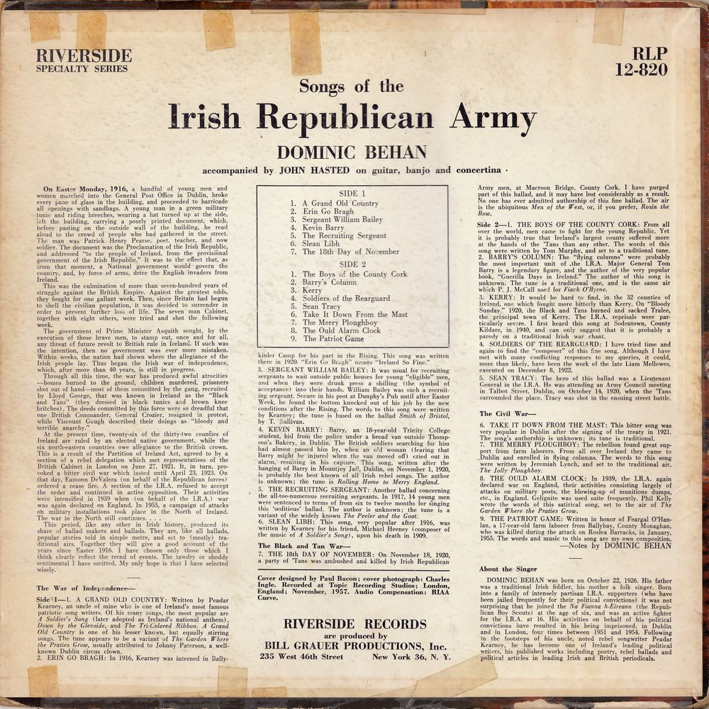 DOMINIC BEHAN was born on October 22, 1926. His father was a traditional Irish fiddler, his mother a folk singer. Born into a family of intensely partisan I.R.A. supporters (who have been jailed frequently for their political convictions) it was not surprising that he joined the Na Fianna h-Eireann (the Republican Boy Scouts) at the age of six, and was an active fighter for the I.R.A. at 16. His activities on behalf of his political convictions have resulted in his being imprisoned, in Dublin and in London, four times between 1951 and 1954. Following in the footsteps of his uncle, noted rebel songwriter Peadar Kearney, he has become one of Ireland's leading political writers, his published works including poetry, rebel ballads and political articles in leading Irish and British periodicals.
