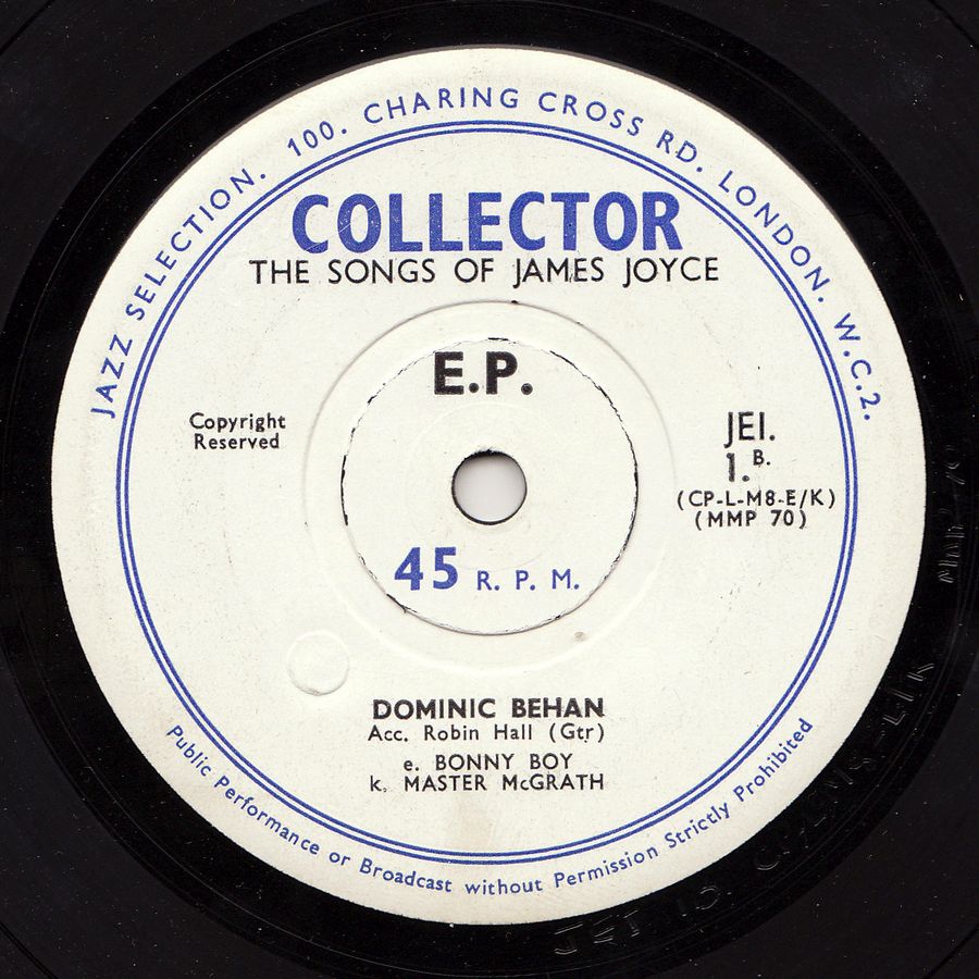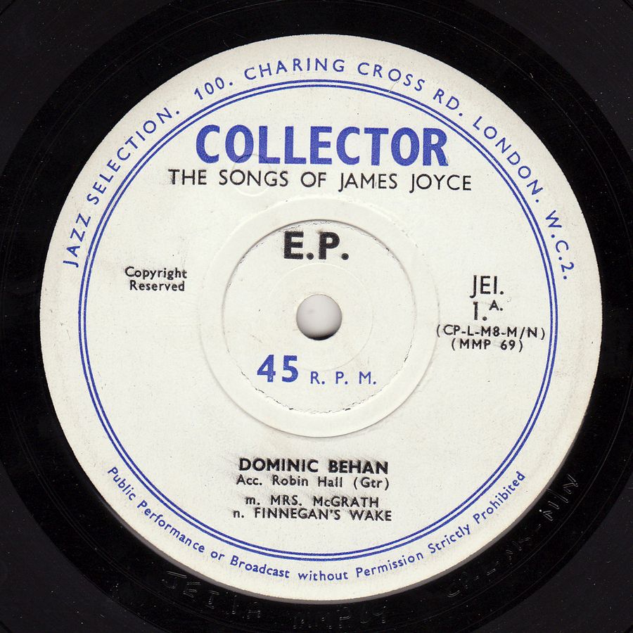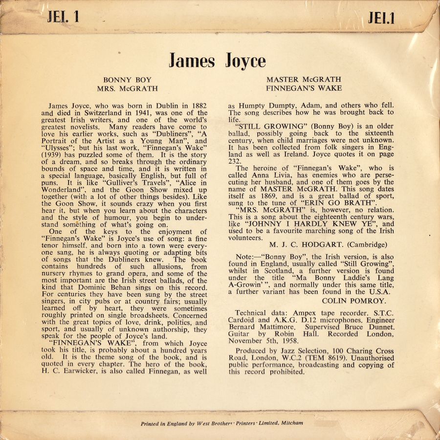 One of the keys to the enjoyment of "Finnegan's Wake" is Joyce's use of song: a fine tenor himself, and born into a town were everyone sang, he is always quoting or adapting bits of songs that the Dubliners knew. The book contains hundreds of such allusions, from nursery rhymes to grand opera, and some of the most important are the Irish street ballads, of the kind that Dominic Behan sings on this record. For centuries they have been sung by the street singers, in city pubs or at country fairs; usually learned off by heart, they were sometimes roughly printed on single broadsheets. Concerned with the great topics of love, drink, politics, and sport, and usually of unknown authorship, they speak for the people of Joyce's land.