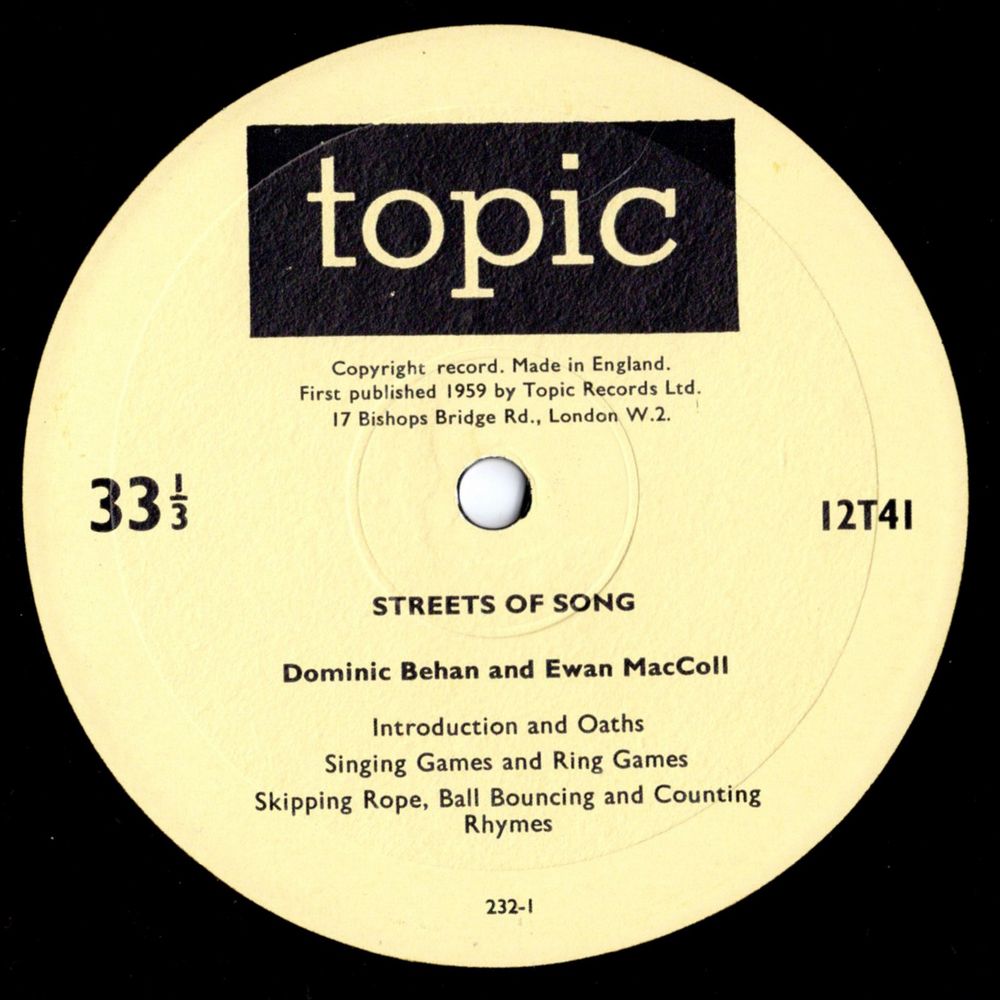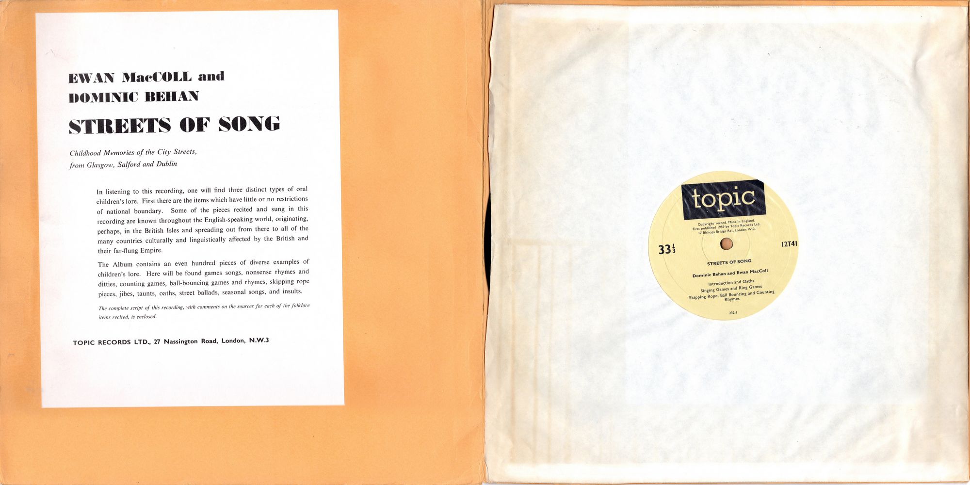First, we are introduced to the cultural milieu with which we are dealing. Poverty, a proud working-class inheritance, slum conditions, and the everyday, mundane things and occurrences affecting the individuals concerned. Next, we are presented with the oral products of that environment, set off against a train of thought concerning those products, not of the children living, playing and reciting those pieces of lore, but of two adult bearers of this urban tradition whose sensitivity to the setting is expressed in terms of mature afterthought. The opportunity presented by this recording to study the whys and wherefores of urban childhood traditions is the next best thing to working in the field with the children themselves.
