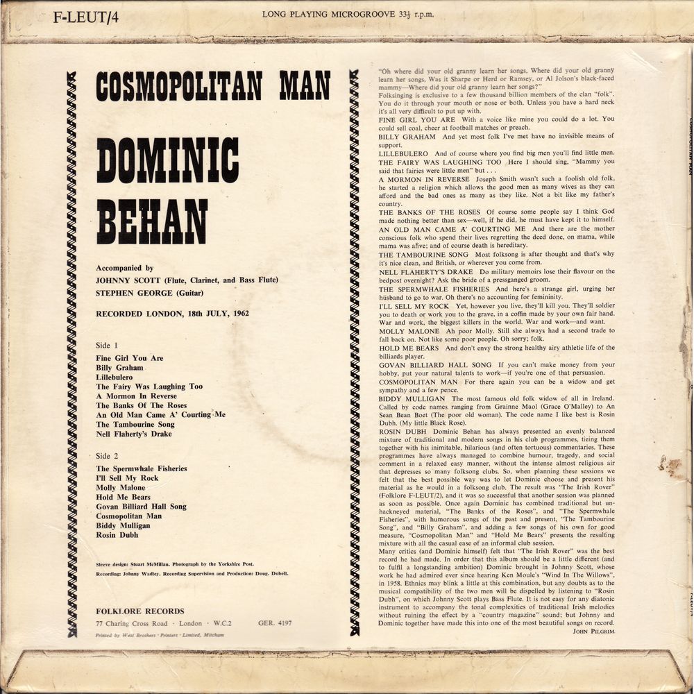 "Cosmopolitan Man" and "Hold Me Bears" presents the resulting mixture with all the casual ease of an informal club session. Many critics (and Dominic himself) felt that "The Irish Rover" was the best record he had made. In order that this album should be a little different (and to fulfil a longstanding ambition) Dominic brought in Johnny Scott, whose work he had admired ever since hearing Ken Moule's "Wind In The Willows", in 1958. Ethnics may blink a little at this combination, but any doubts as to the musical compatibility of the two men will be dispelled by listening to "Rosin Dubh", on which Johnny Scott plays Bass Flute. It is not easy for any diatonic instrument to accompany the tonal complexities of traditional Irish melodies without ruining the effect by a "country magazine" sound: but Johnny and Dominic together have made this into one of the most beautiful songs on record.