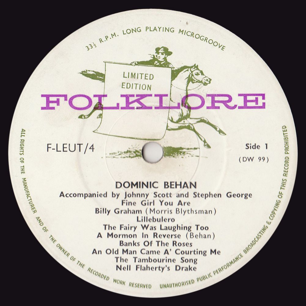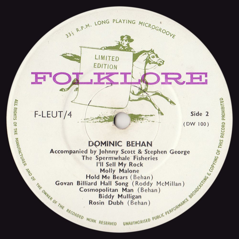 Dominic Behan has always presented an evenly balanced mixture of traditional and modern songs in his club programmes, tieing them together with his inimitable, hilarious (and often tortuous) commentaries. These programmes have always managed to combine humour, tragedy, and social comment in a relaxed easy manner, without the intense almost religious air that depresses so many folksong clubs. So, when planning these sessions we felt that the best possible way was to let Dominic choose and present his material as he would in a folksong club. The result was "The Irish Rover" (Folklore F-LEUT/2). and it was so successful that another session was planned as soon as possible. Once again Dominic has combined traditional but unhackneyed material. "The Banks of the Roses", and "The Spermwhale Fisheries", with humorous songs of the past and present, "The Tambourine Song", and "Billy Graham", and adding a few songs of his own for good measure.