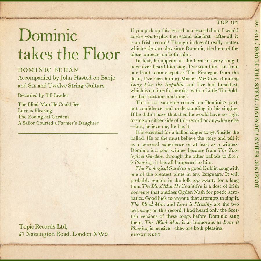 The Zoological Gardens a good Dublin song with one of the greatest tunes in any language. It will probably remain in the folk top twenty for a long time. The Blind Man He Could See is a dose of Irish nonsense that outdoes Ogden Nash for poetic acrobatics. Good luck to anyone that attempts to sing it. The Blind Man and Love is Pleasing are the two best songs on this record. I had heard only the Scottish versions of these songs before Dominic sang them. The Blind Man is as humorous as Love is Pleasing is pensive — they are both pleasing.