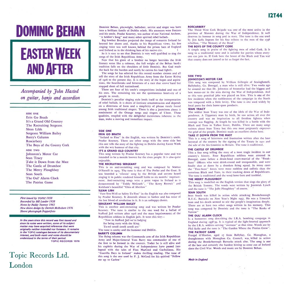 In the years since this record was first issued and since its notes were written, some of its subject matter may have acquired references that were originally neither intended nor foreseen. It remains in the TOPIC catalogue because of its documentary interest, and both music and notes should be understood in the terms of their period.