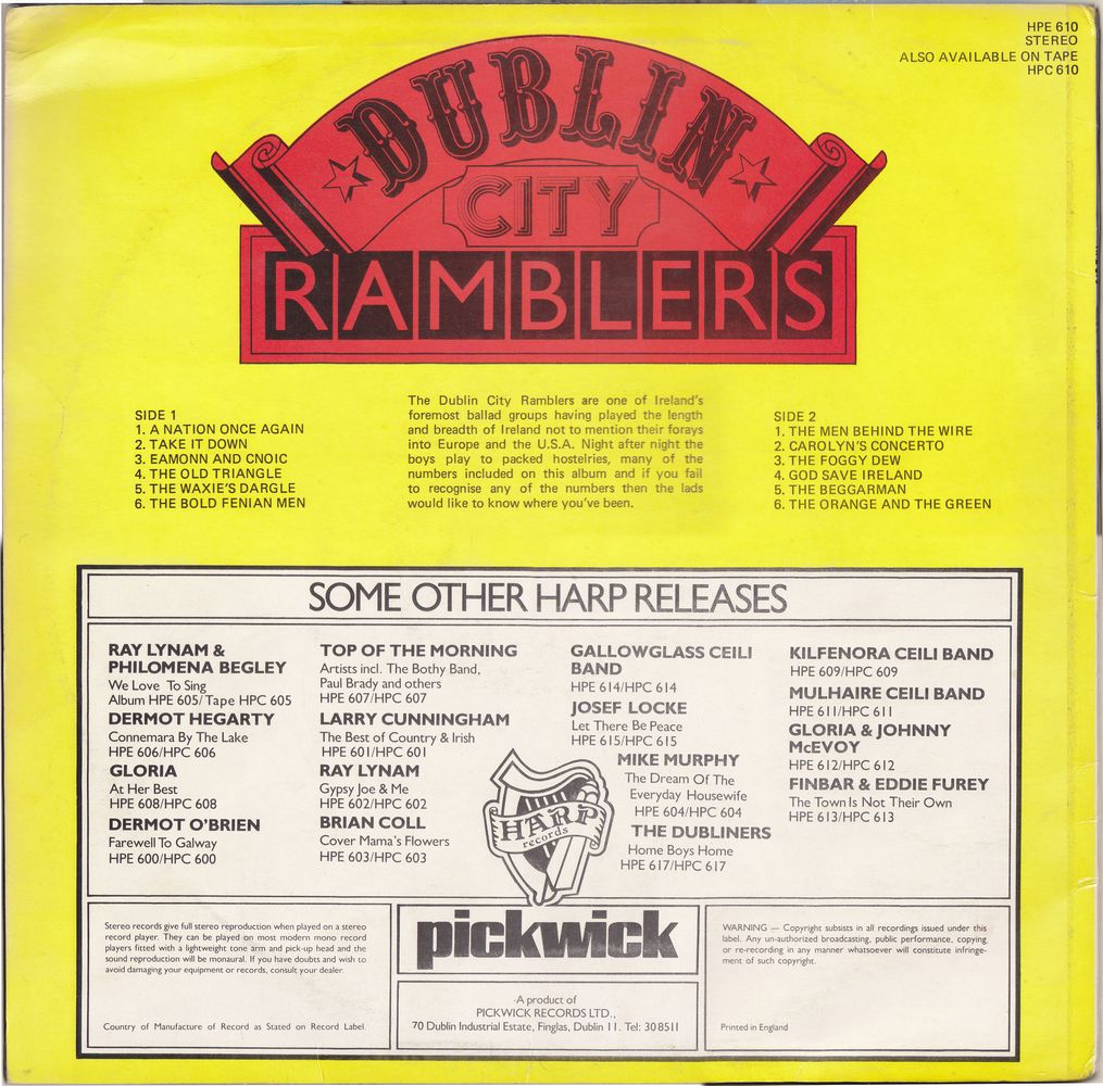 The Dublin City Ramblers are one of Ireland's foremost ballad groups having played the length and breadth of Ireland not to mention their forays into Europe and the U.S.A. Night after night the boys play to packed hostelries, many of the numbers included on this album and if you fail to recognise any of the numbers then the lads would like to know where you've been.have also borne in mind the fact that we are Irish and should respect the ideals and aims of great Irishmen who were and still are prepared to suffer and die so that Ireland may be A NATION ONCE AGAIN.