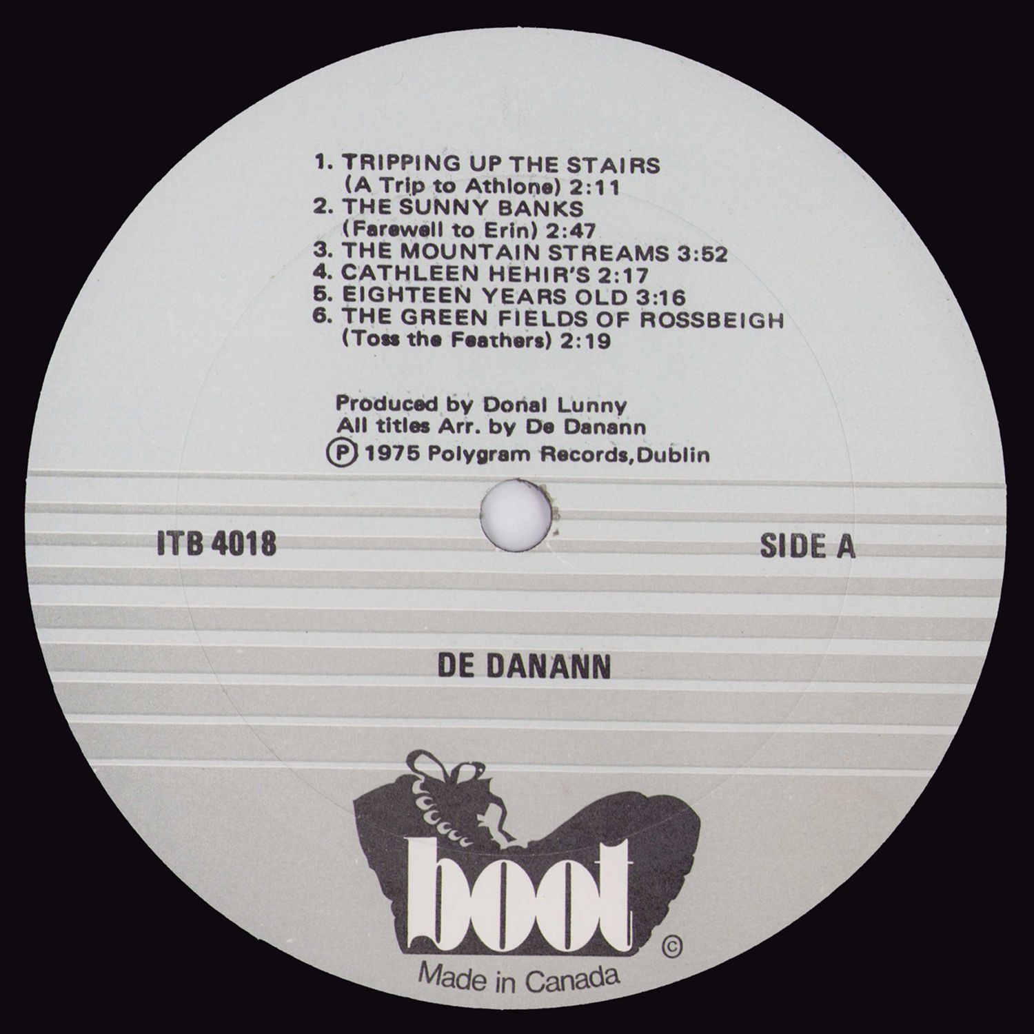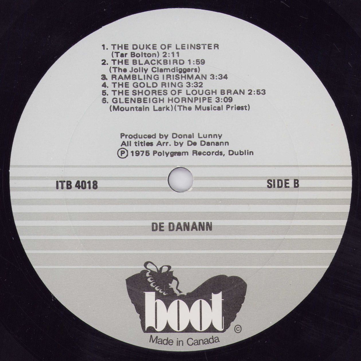 Based in Spiddal, the focal point of the Connemara Gaeltacht, DE DANANN are a unique combination of the traditional music styles of Galway and Kerry. Their idiom has evolved through many 'sessions' along the Connemara coast; in Hughes's, An Cruiscin Lan, Jimmy Faherty's, and under the ever-hospitable roof of Cathleen Hehir in Camus. Dolores Keane and Frankie Gavin are both from the eastern shores of Lough Corrib, from the musically fertile area of Caherlistrane and Annaghdown. Dolores is a member of one of our best-loved musical families, and her cool and impeccable style owes much to the discipline of the unison singing of her aunts, Rita and Sarah. Her repertoire of songs reflects the constant stream of singers and musicians who came to participate in the musical life of the Keanes of Caherlistrane. On this record she sings a version of "The Mountain Streams" taught her by Paddy Tunney, and it was from two other Northern visitors, Len Graham and Joe Holmes, that she learned "The Rambling Irishman". Though Frankie Gavin is the youngest member of the group, his playing has already a flair and maturity that places him among a handful of our most promising young musicians. Apart from 'conventional' fiddle technique, there are echoes of the fiddling styles found in Kerry and Donegal. His playing of Willie Clancy's "Gold Ring" shows fidelity to the phrasing, triplets and cranning of uilleann piping. Charlie Piggott is the multi-instrumentalist of the group, and the only Southerner. From his father who was born near Glenbeigh, he inherits the ten key melodeon style of East Kerry. Infectiously clear and sunny, the music is much akin to the concertina playing of South Galway and Clare. One of the most distinctive DE DANANN sounds, is that of the bouzouki duets. Charlie's banjo and bouzouki playing is here coupled with the contrasting style of Alec Finn's. Alec plays a six-string bouzouki which he tunes modally in the original Greek manner. Born in Yorkshire of Irish parents, he moved back to Dublin 12 years ago, and from there to Spiddal. He has adapted the Greek characterisation of melodic and rhythmic inventiveness to the Irish way of strong, single-line playing, in a way that transcends all notion of mere accompaniment. It is his free ranging playing, unobtrusively weaving among the other instruments, which gives the rhythmic buoyancy so central to the DE DANANN sound. The percussive powerhouse for the group is the only true-blue Galway citizen, the inimitable Johnny "Ringo' McDonagh. The sheer variety of sound and rhythm found in his bodhran playing must put him among the best in the country, and his unique bone playing may be noticeable on one of the tracks ("The Green Fields of Rossbeigh"). Followers of folk music should find DE DANANN a refreshing addition to the traditional musical culture that still thrives in Ireland.