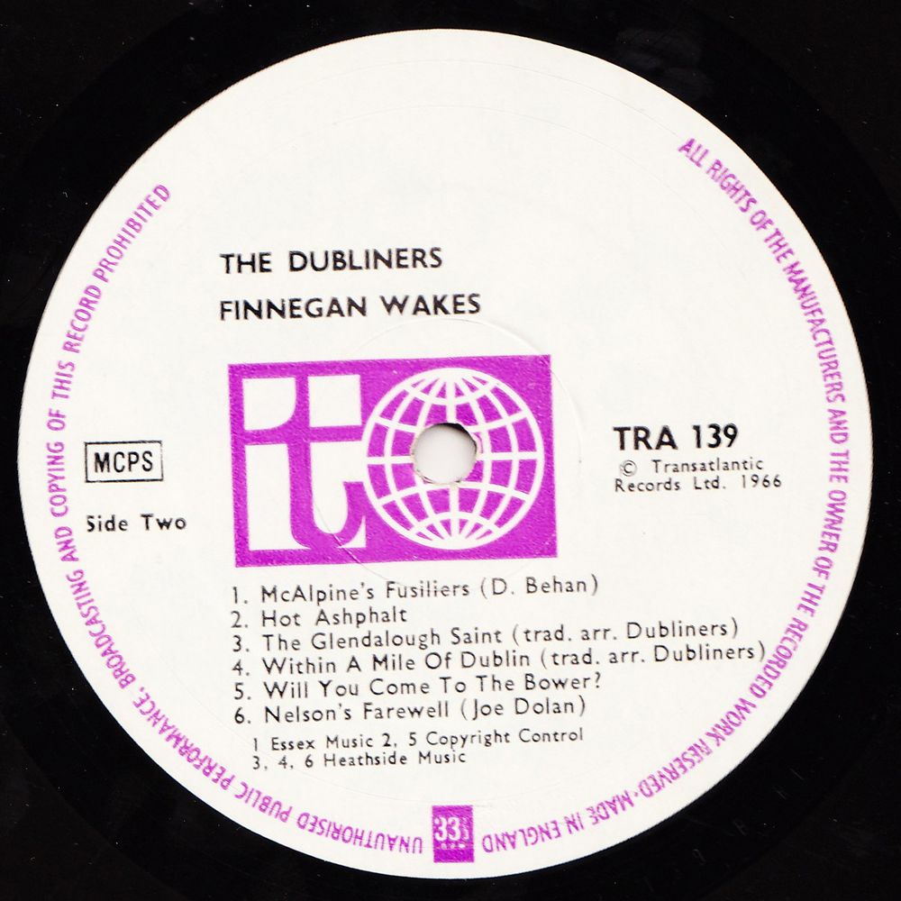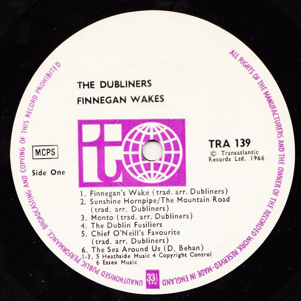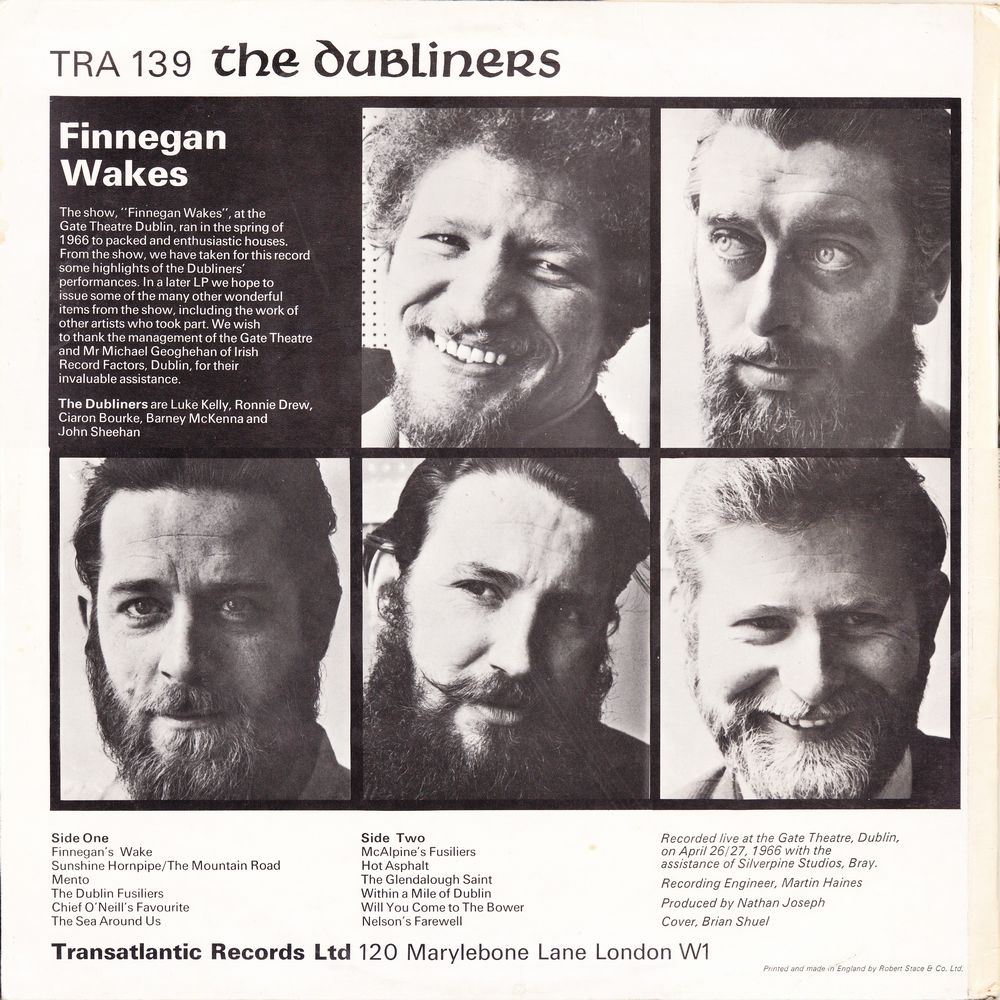 The show, "Finnegan Wakes", at the Gate Theatre Dublin, ran in the spring of 1966 to packed and enthusiastic houses. From the show, we have taken for this record some highlights of the Dubliners' performances. In a later LP we hope to issue some of the many other wonderful items from the show, including the work of other artists who took part. We wish to thank the management of the Gate Theatre and Mr. Michael Geoghehan of Irish Record Factors, Dublin, for their invaluable assistance.