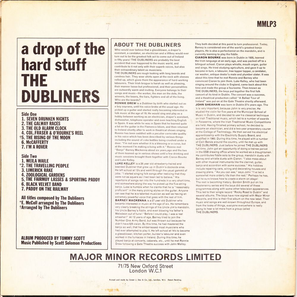 The rest is becoming history. Gordon Smith put on his Hootenanny series and the boys did several of these programmes along with some other television appearances. This led to their single record "Rocky Road to Dublin" and several albums. The boys have now signed with Major Minor Records, and this is their first album on the new label. Their music and songs are well-known throughout Europe, and from the looks of things, everyone everywhere is really going to hear a lot more from a group called THE DUBLINERS.