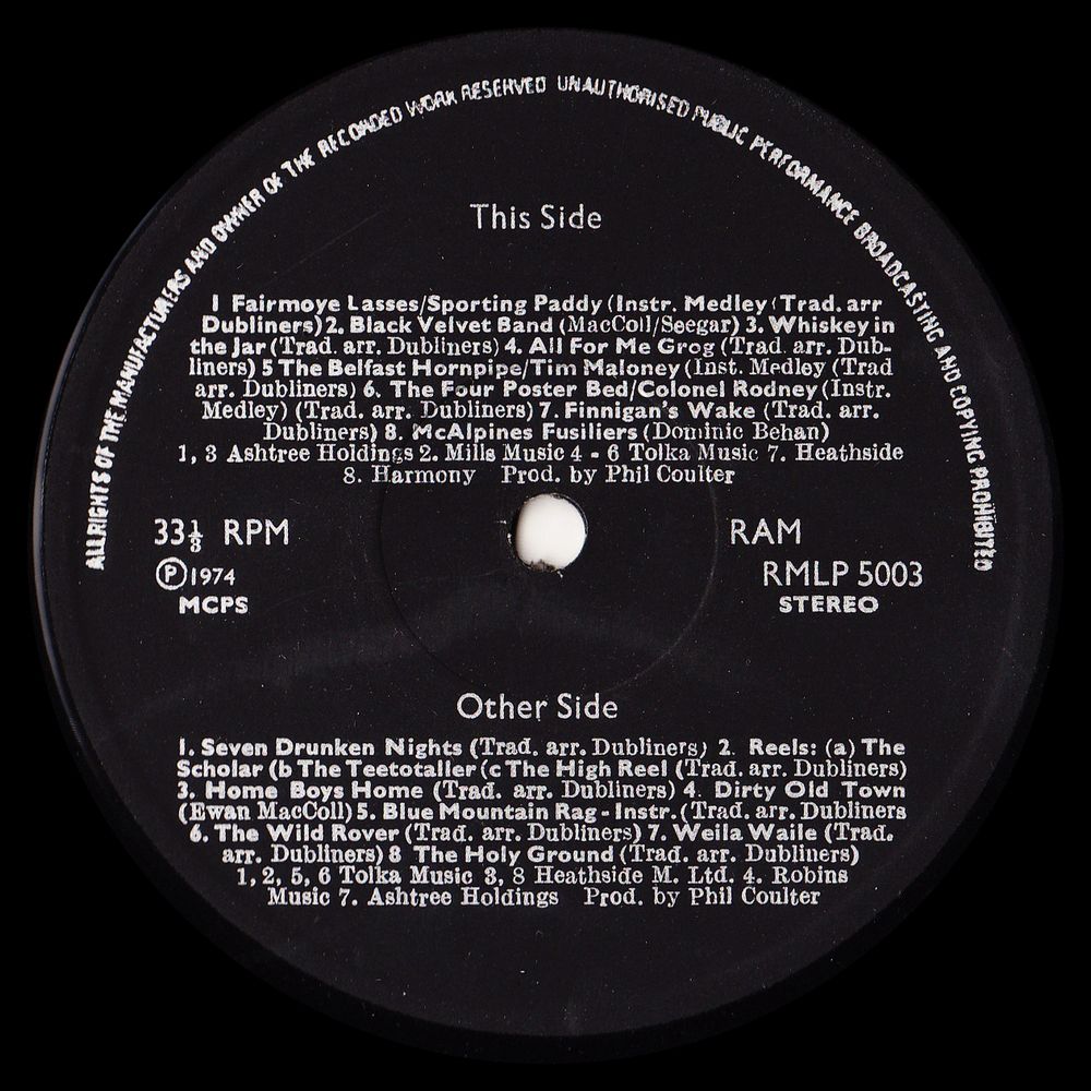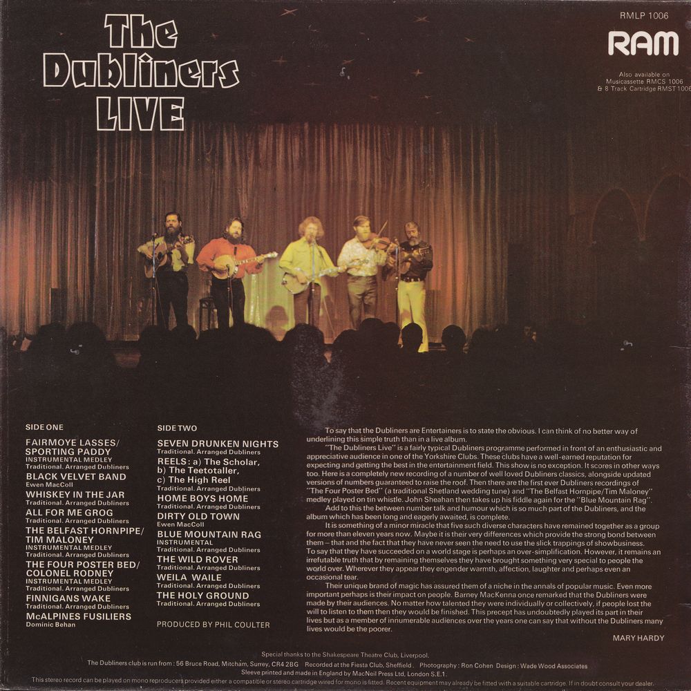 'The Dubliners Live" is a fairly typical Dubliners programme performed in front of an enthusiastic and appreciative audience in one of the Yorkshire Clubs These clubs have a well-earned reputation for expecting and getting the best in the entertainment field. This show is no exception It scores in other ways too Here is a completely new recording of a number of well loved Dubliners classics, alongside updated versions of numbers guaranteed to raise the roof. Then there are the first ever Dubliners recordings of "The Four Poster Bed" (a traditional Shetland wedding tune) and "The Belfast Hornpipe/Tim Maloney" medley played on tin whistle. John Sheahan then takes up his fiddle again for the "Blue Mountain Rag".