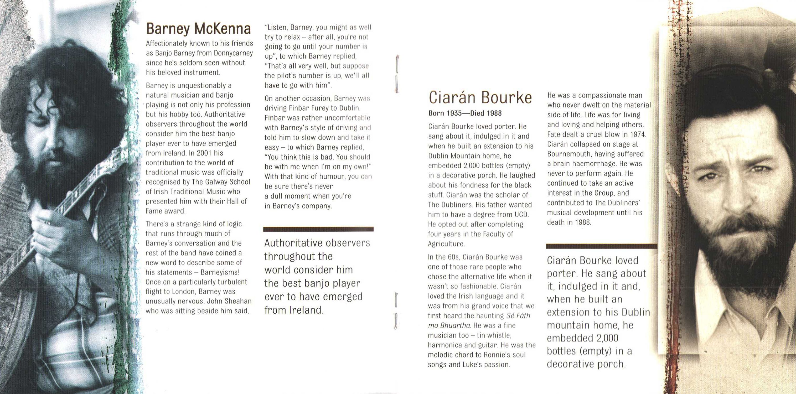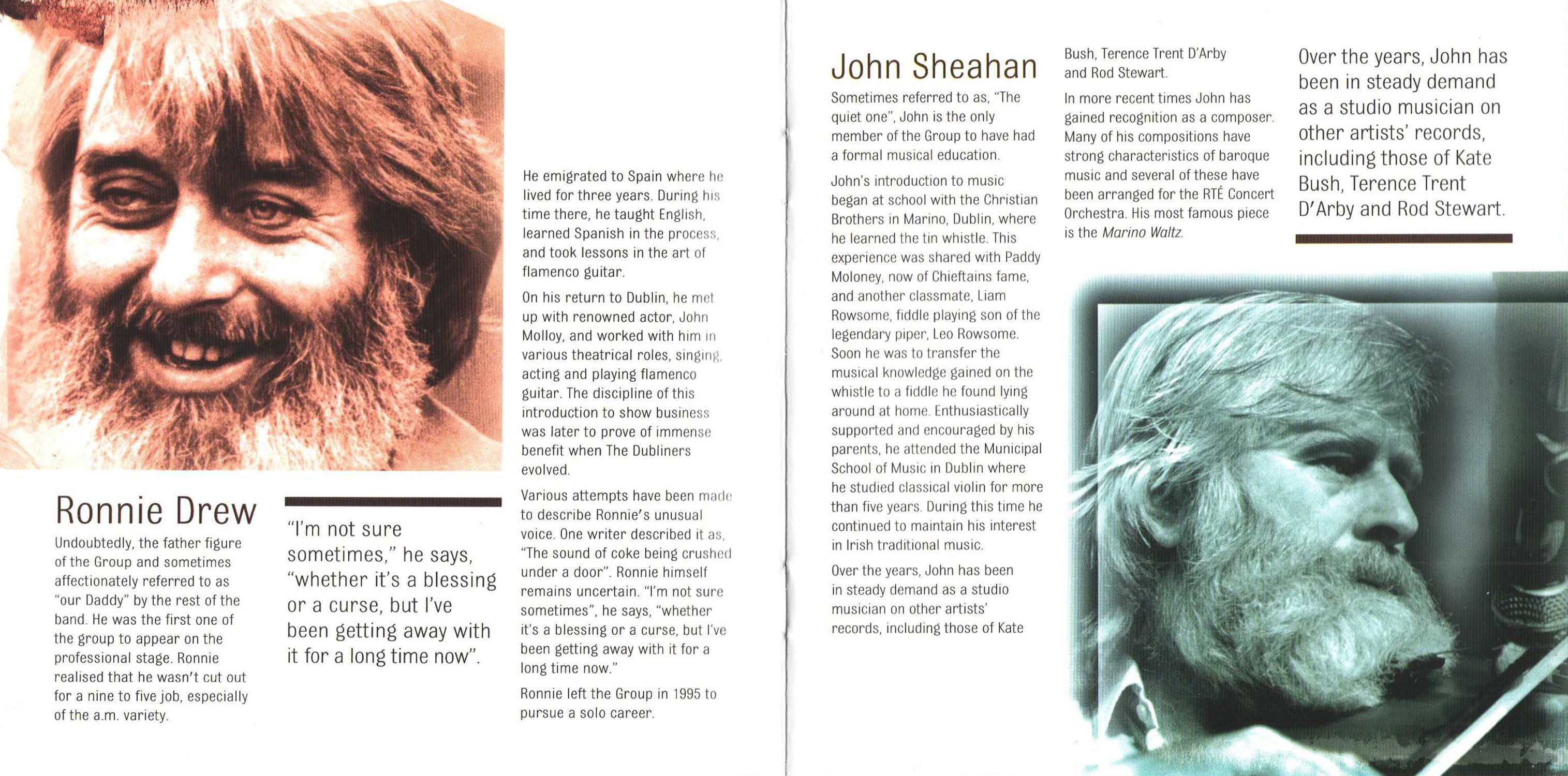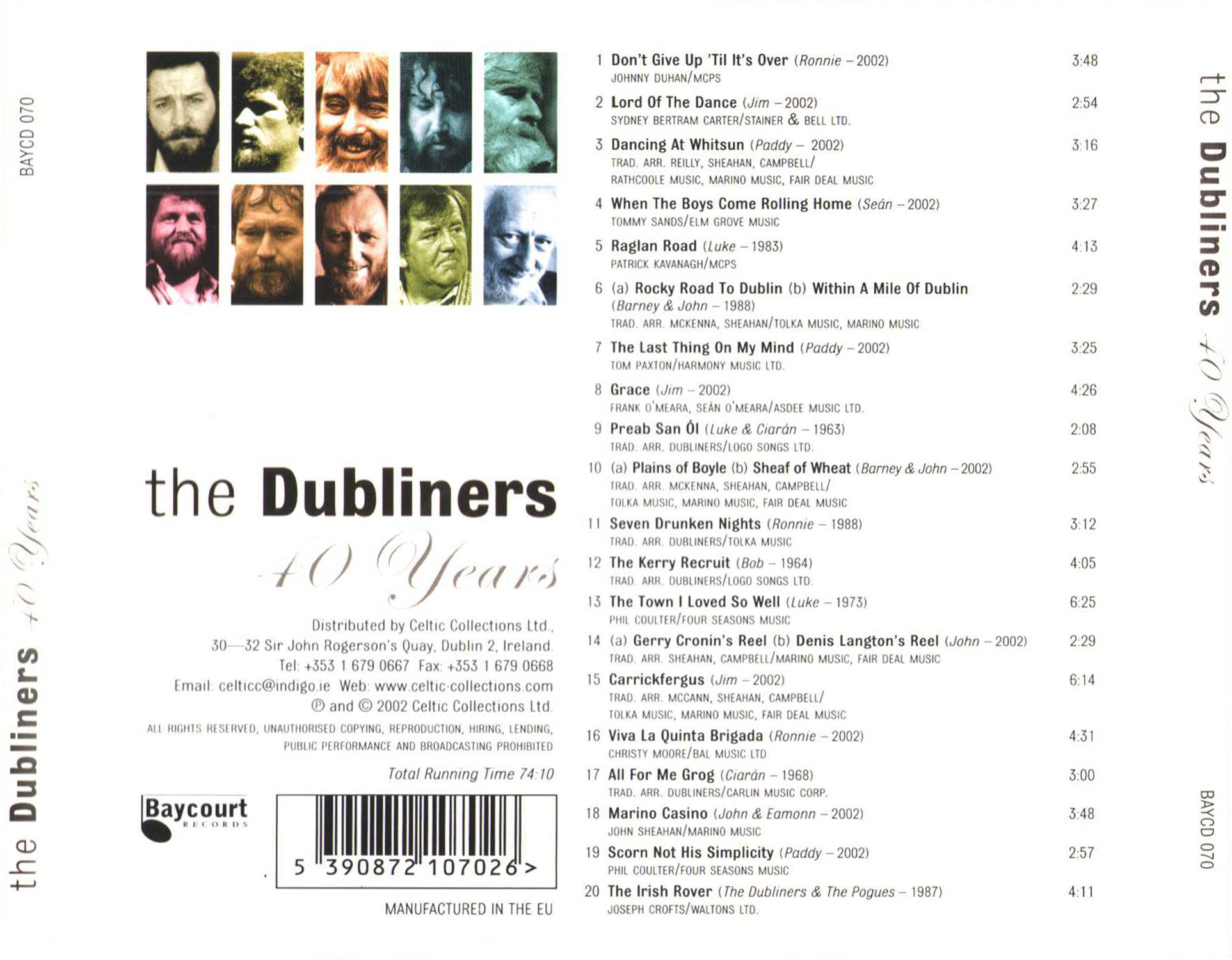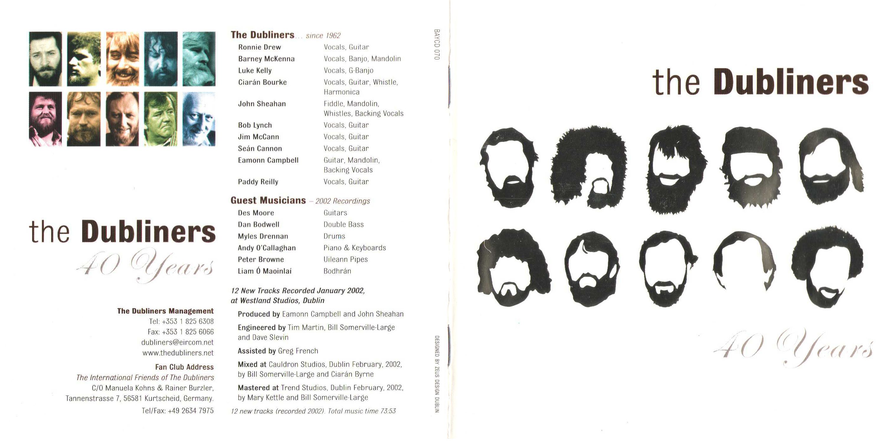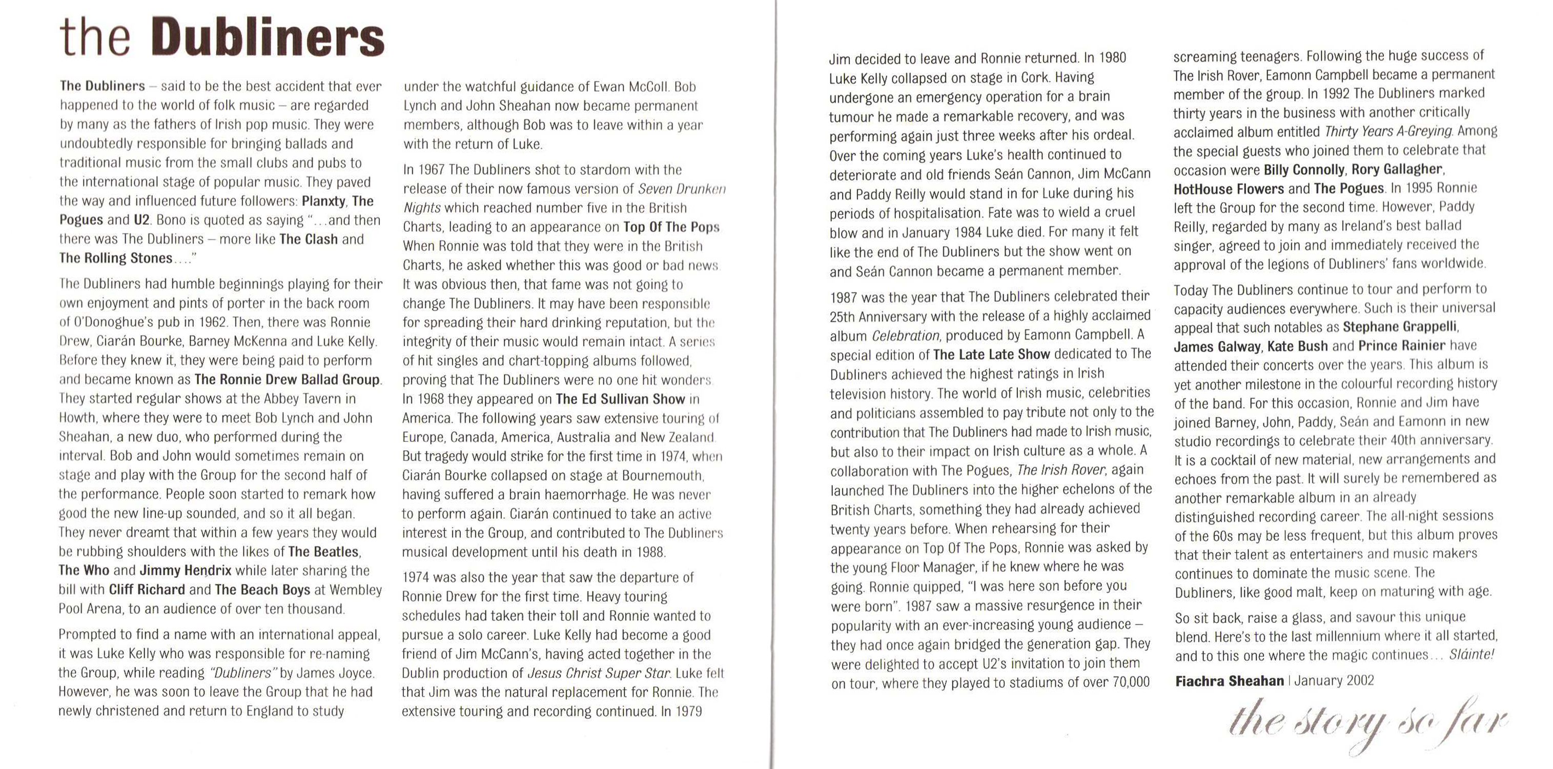 Today The Dubliners continue to tour and perform to capacity audiences everywhere. Such is their universal appeal that such notables as Stephane Grappelli, James Galway, Kate Bush and Prince Rainier have attended their concerts over the years. This album is yet another milestone in the colourful recording history of the band. For this occasion, Ronnie and Jim have joined Barney, John, Paddy, Seán and Eamonn in new studio recordings to celebrate their 40th anniversary. It is a cocktail of new material, new arrangements and echoes from the past. It will surely be remembered as another remarkable album in an already distinguished recording career. The all-night sessions of the 60s may be less frequent, but this album proves that their talent as entertainers and music makers continues to dominate the music scene. The Dubliners, like good malt, keep on maturing with age. So sit back, raise a glass, and savour this unique blend. Here's to the last millennium where it all started, and to this one where the magic continues … Slainte!