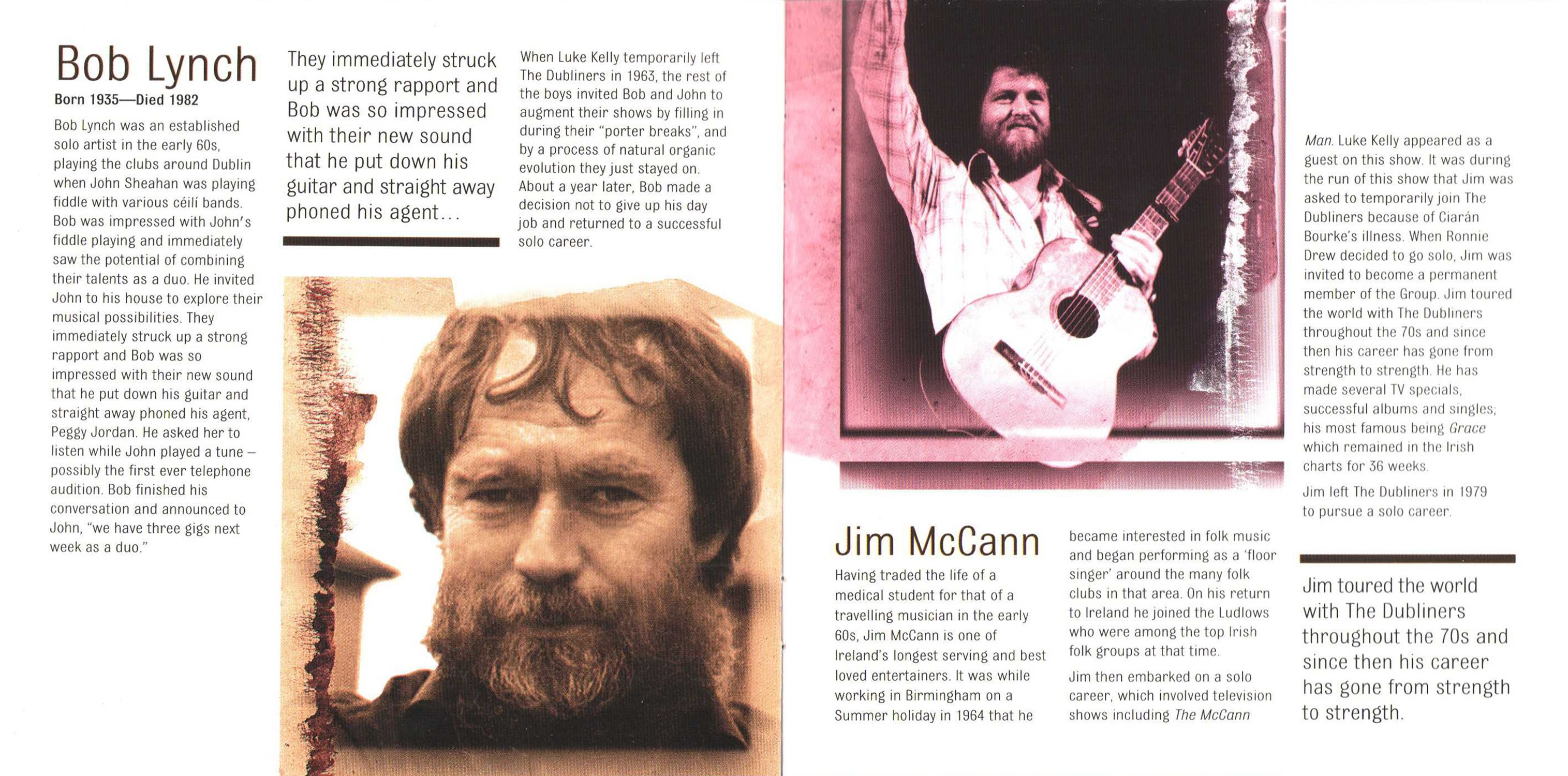When Luke Kelly temporarily left The Dubliners in 1963, the rest of the boys invited Bob and John to augment their shows by filling in during their "porter breaks", and by a process of natural organic evolution they just stayed on. About a year later, Bob made a decision not to give up his day job and returned to a successful solo career.