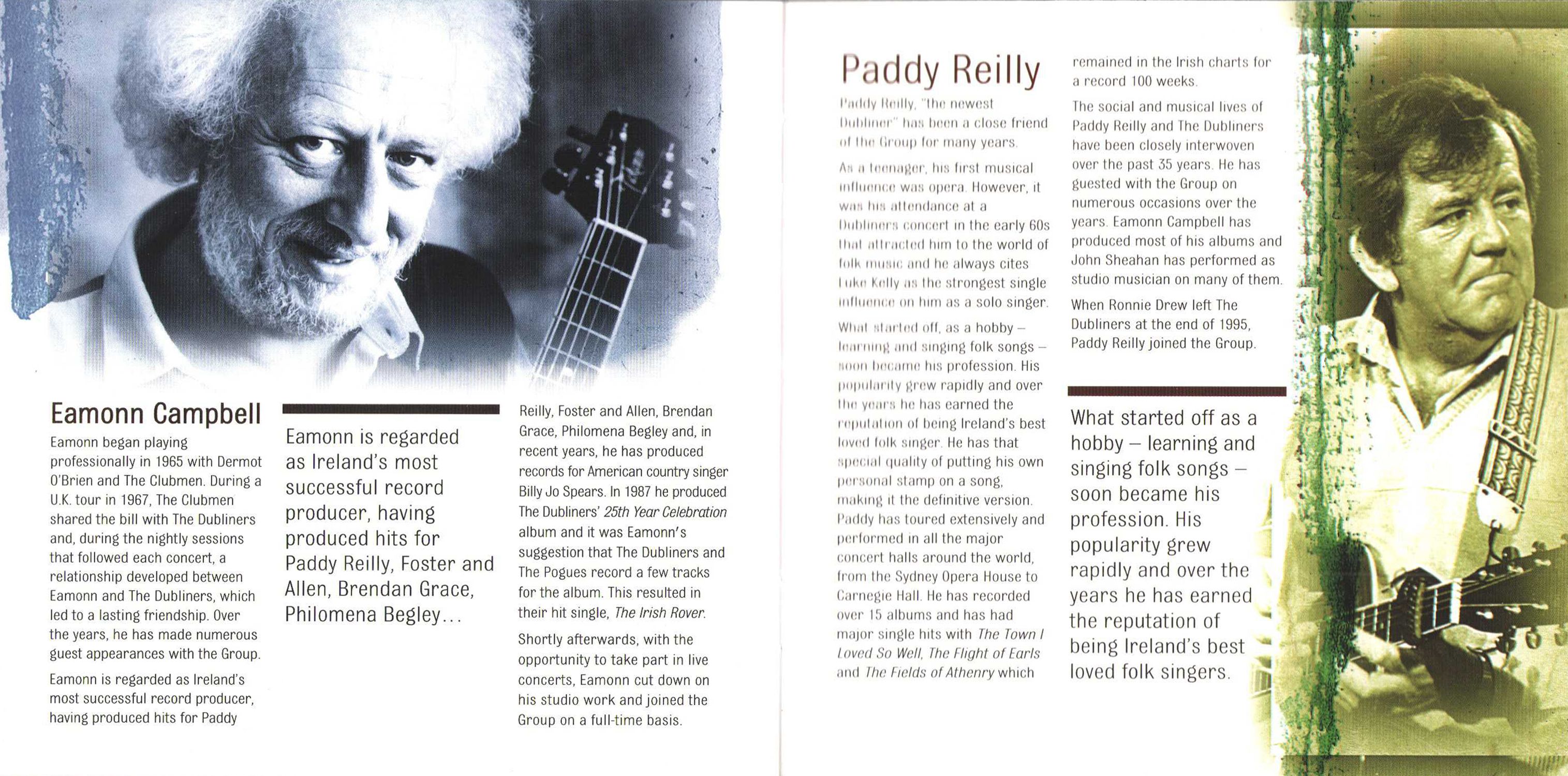 The social and musical lives of Paddy Reilly and The Dubliners have been closely interwoven over the past 35 years. He has guested with the Group on numerous occasions over the years. Eamonn Campbell has produced most of his albums and John Sheahan has performed as studio musician on many of them.