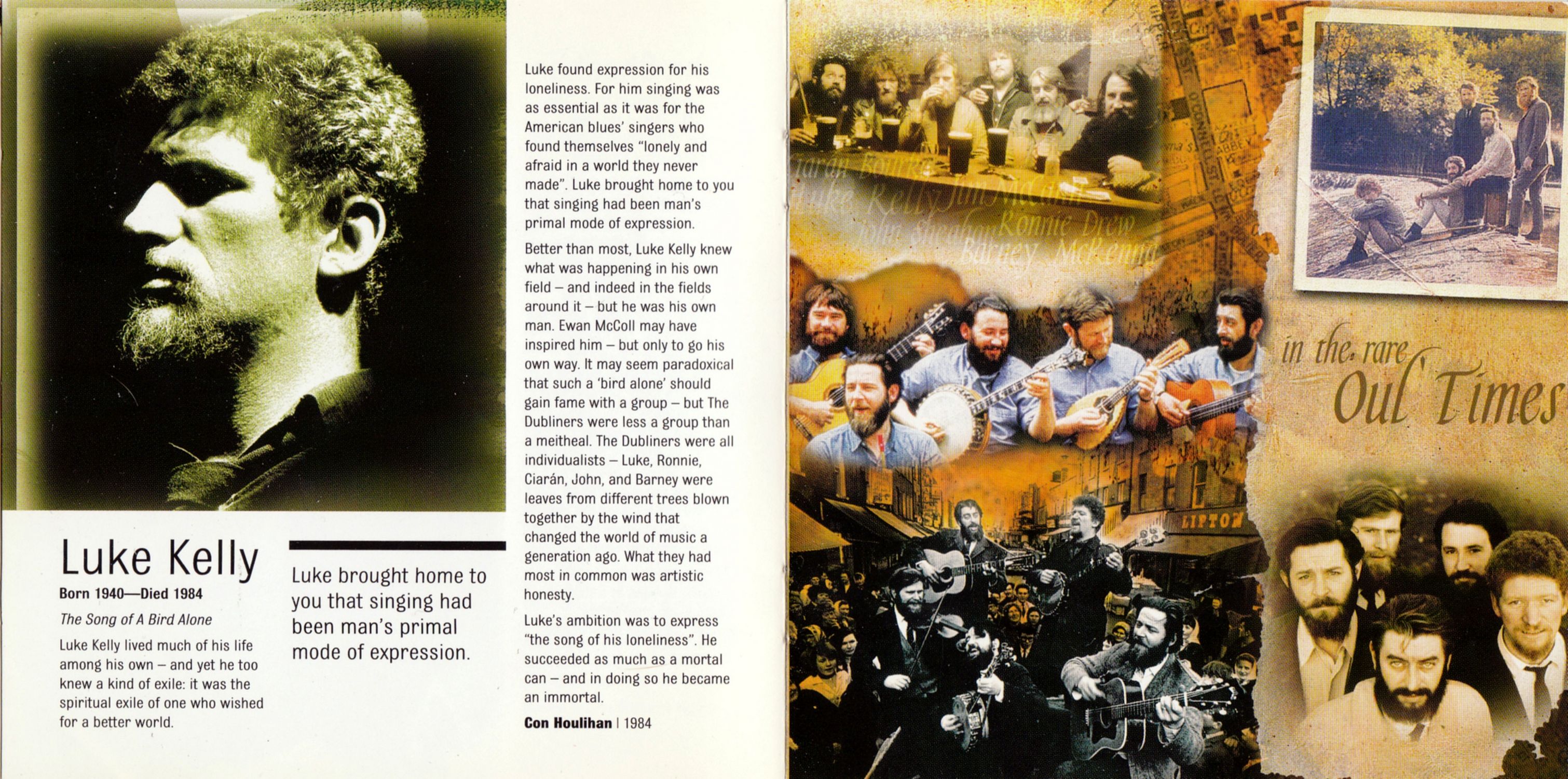 Better than most, Luke Kelly knew what was happening in his own field — and indeed in the fields around it — but he was his own man. Ewan McColl may have inspired him — but only to go his own way. It may seem paradoxical that such a 'bird alone' should gain fame with a group — but The Dubliners were less a group than a meitheal. The Dubliners were all individualists — Luke, Ronnie, Ciarán, John, and Barney were leaves from different trees blown together by the wind that changed the world of music a generation ago. What they had most in common was artistic honesty.