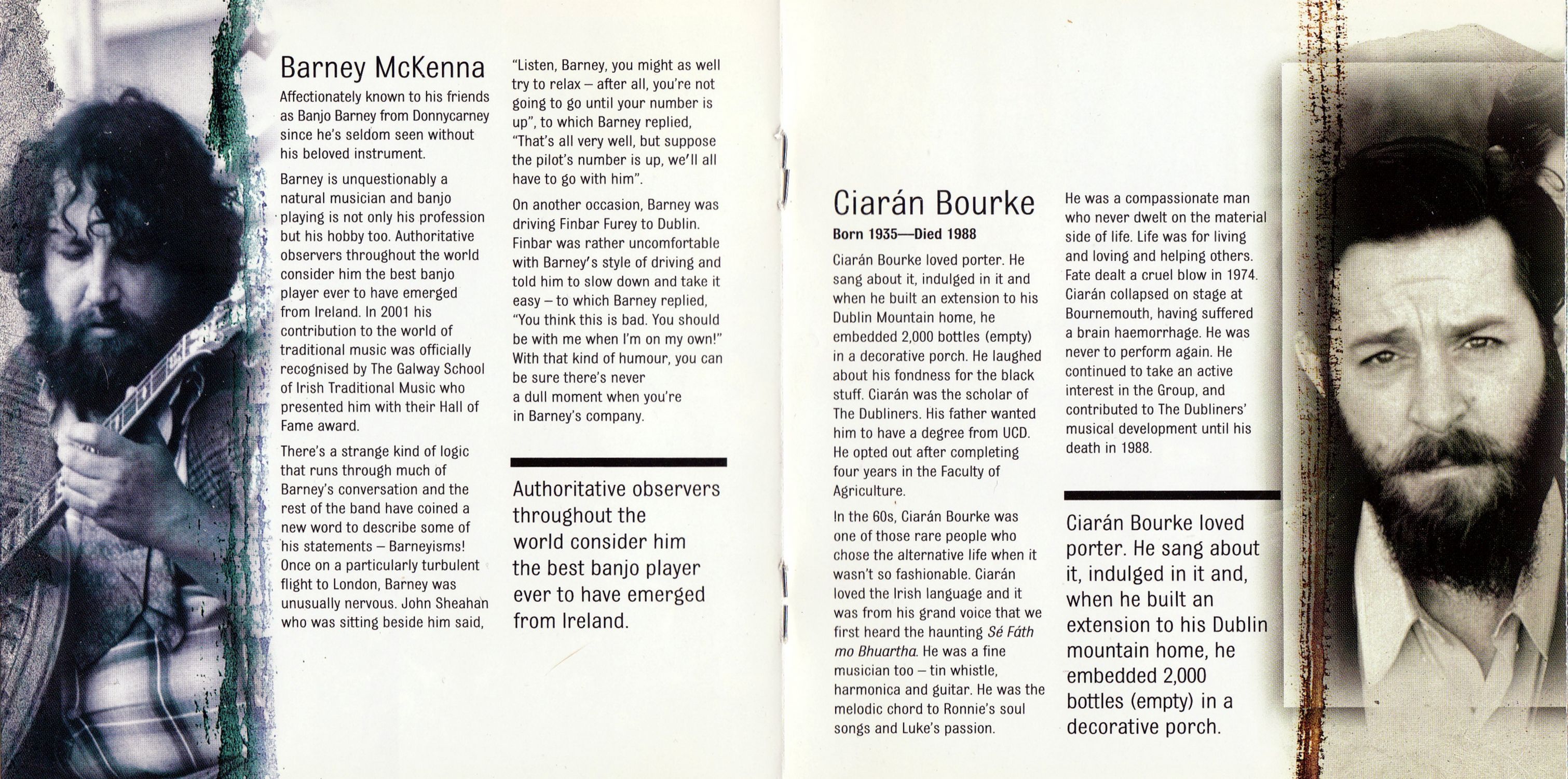 Ciarán Bourke loved porter. He sang about it, indulged in it and when he built an extension to his Dublin Mountain home, he embedded 2,000 bottles (empty) in a decorative porch. He laughed about his fondness for the black stuff. Ciarán was the scholar of The Dubliners. His father wanted him to have a degree from UCD. He opted out after completing four years in the Faculty of Agriculture.