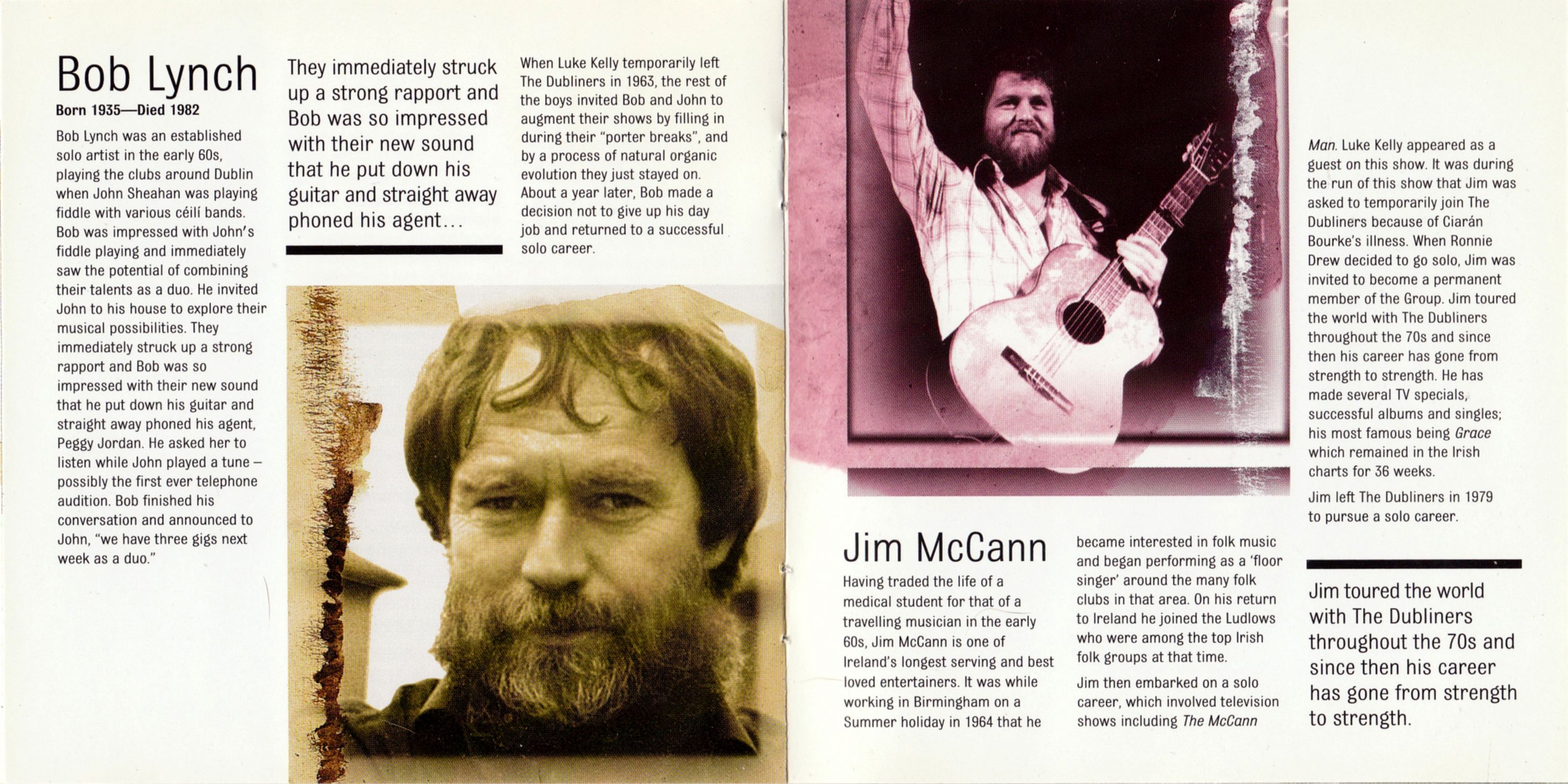 When Luke Kelly temporarily left The Dubliners in 1963, the rest of the boys invited Bob and John to augment their shows by filling in during their "porter breaks", and by a process of natural organic evolution they just stayed on. About a year later, Bob made a decision not to give up his day job and returned to a successful solo career.