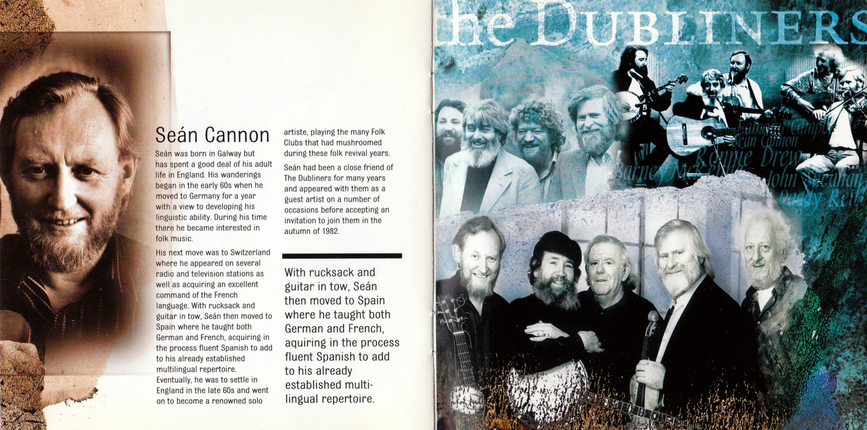 His next move was to Switzerland where he appeared on several radio and television stations as well as acquiring an excellent command of the French language. With rucksack and guitar in tow, Seán then moved to Spain where he taught both German and French, acquiring in the process fluent Spanish to add to his already established multilingual repertoire. Eventually, he was to settle in England in the late 60s and went on to become a renowned solo artiste, playing the many Folk Clubs that had mushroomed during these folk revival years.