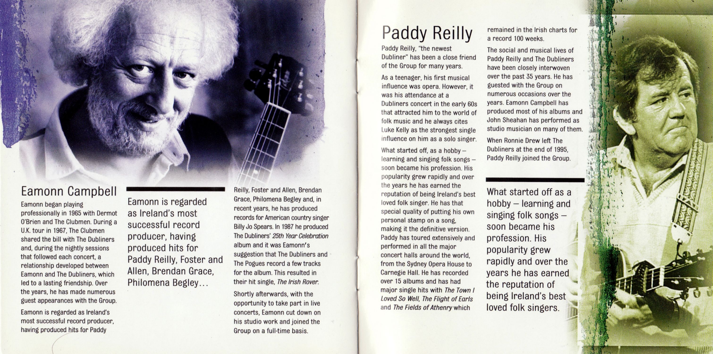 The social and musical lives of Paddy Reilly and The Dubliners have been closely interwoven over the past 35 years. He has guested with the Group on numerous occasions over the years. Eamonn Campbell has produced most of his albums and John Sheahan has performed as studio musician on many of them.