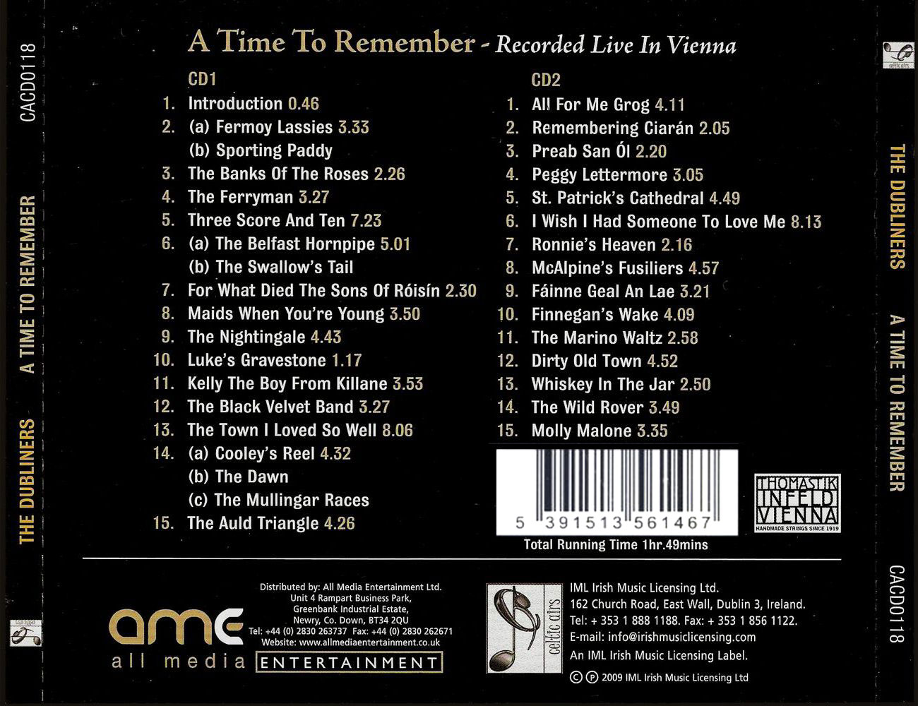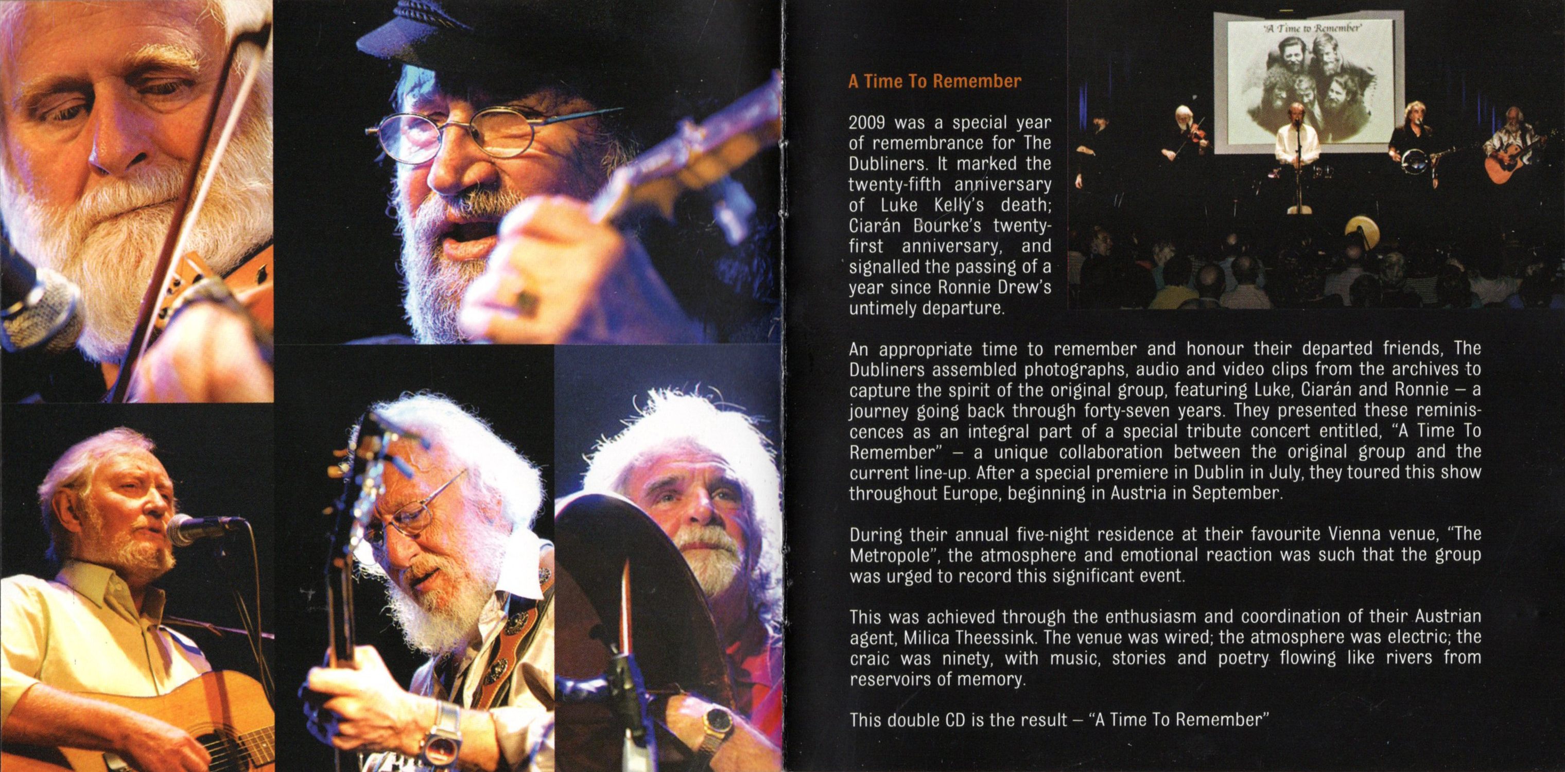 An appropriate time to remember and honour their departed friends, The Dubliners assembled photographs, audio and video clips from the archives to capture the spirit of the original group, featuring Luke, Ciarán and Ronnie — a journey going back through forty-seven years. They presented these reminiscences as an integral part of a special tribute concert entitled, "A Time To Remember" — a unique collaboration between the original group and the current line-up. After a special premiere in Dublin in July, they toured this show throughout Europe, beginning in Austria in September.