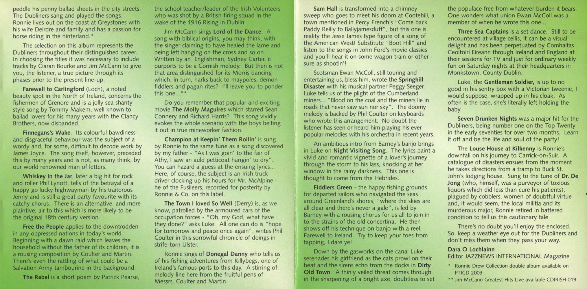 The selection on this album represents the Dubliners throughout their distinguished career. In choosing the titles it was necessary to include tracks by Ciaran Bourke and Jim McCann to give you, the listener, a true picture through its phases prior to the present line-up.