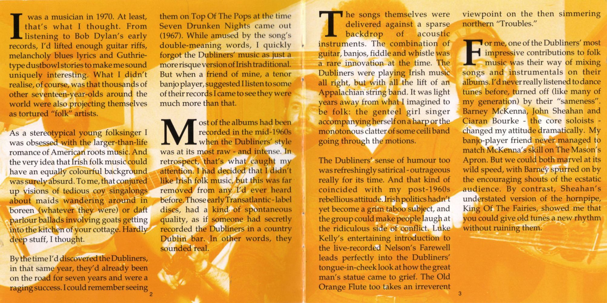 The Dubliners' sense of humour too was refreshingly satirical — outrageous really for its time. And that kind of coincided with my post-1960s rebellious attitude. Irish politics hadn't yet become a grim taboo subject, and the group could make people laugh at the ridiculous side of conflict. Luke Kelly's entertaining introduction to the live-recorded Nelson's Farewell leads perfectly into the Dubliners' tongue-in-cheek look at how the great man's statue came to grief. The Old Orange Flute too takes an irreverent viewpoint on the then simmering northern "Troubles."