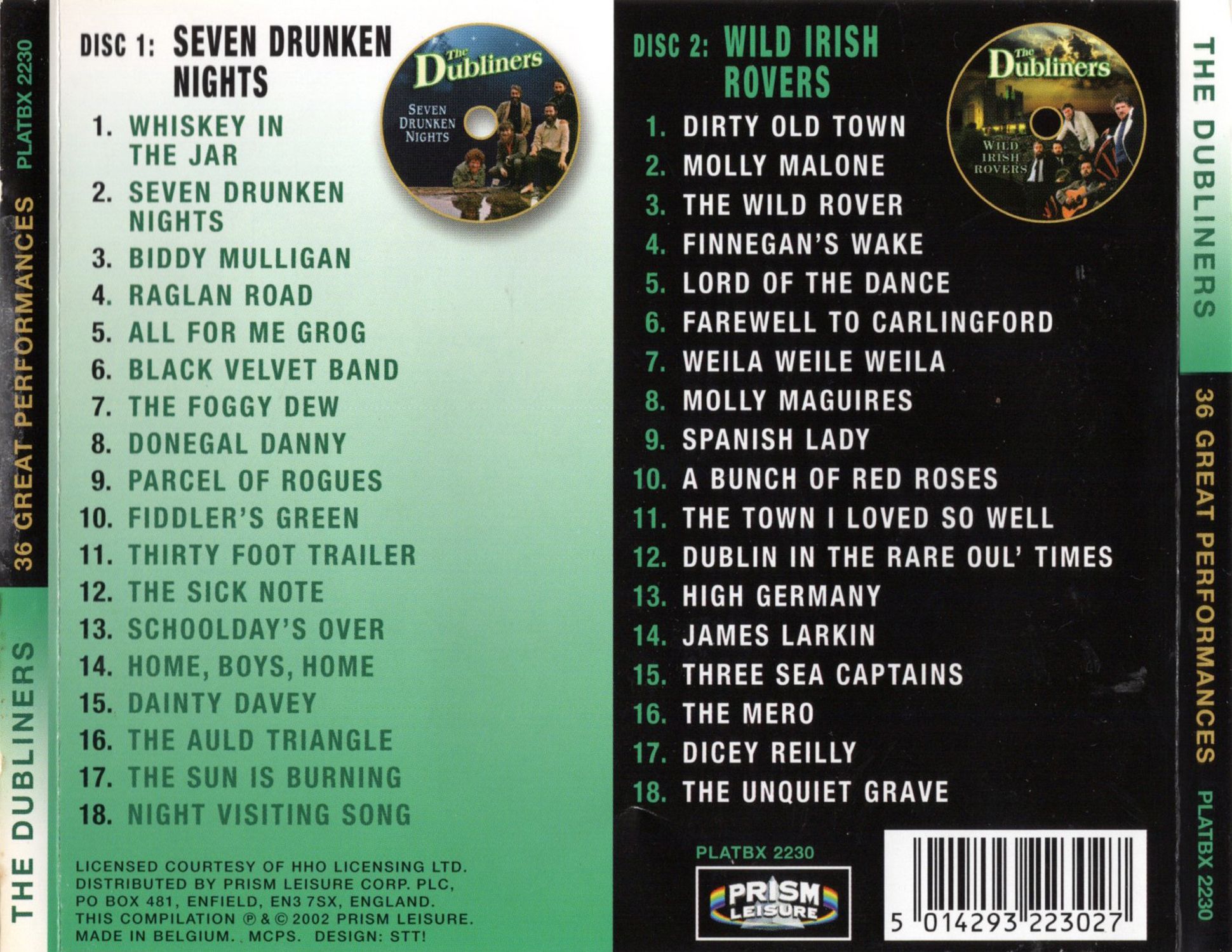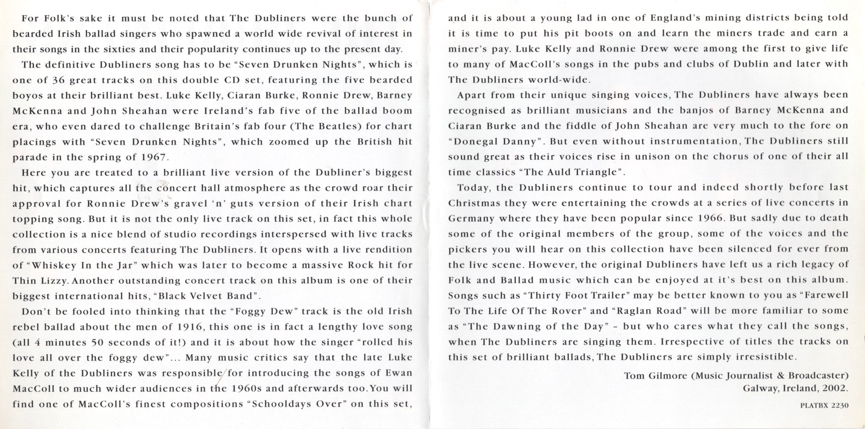 The definitive Dubliners song has to be "Seven Drunken Nights", which is one of 36 great tracks on this double CD set, featuring the five bearded boyos at their brilliant best. Luke Kelly, Ciaran Burke, Ronnie Drew, Barney McKenna and John Sheahan were Ireland's fab five of the ballad boom era, who even dared to challenge Britain's fab four (The Beatles) for chart placings with "Seven Drunken Nights", which zoomed up the British hit parade in the spring of 1967.