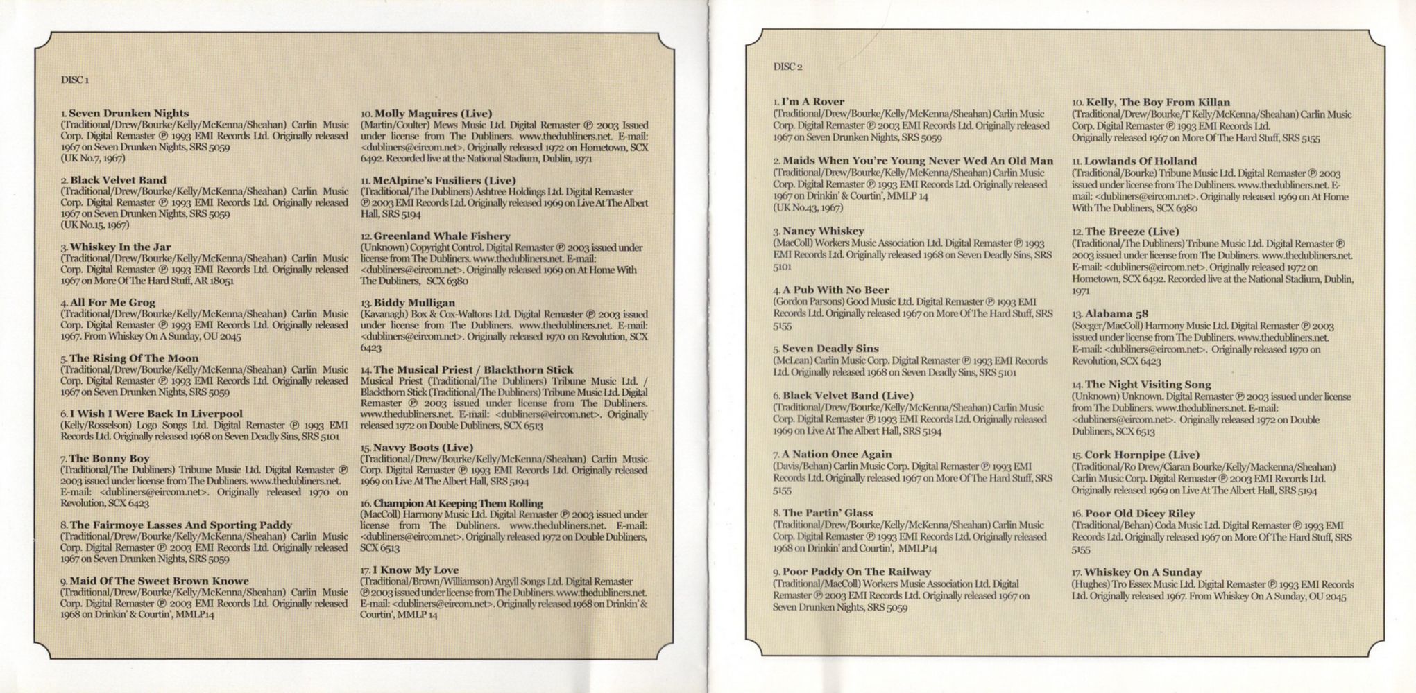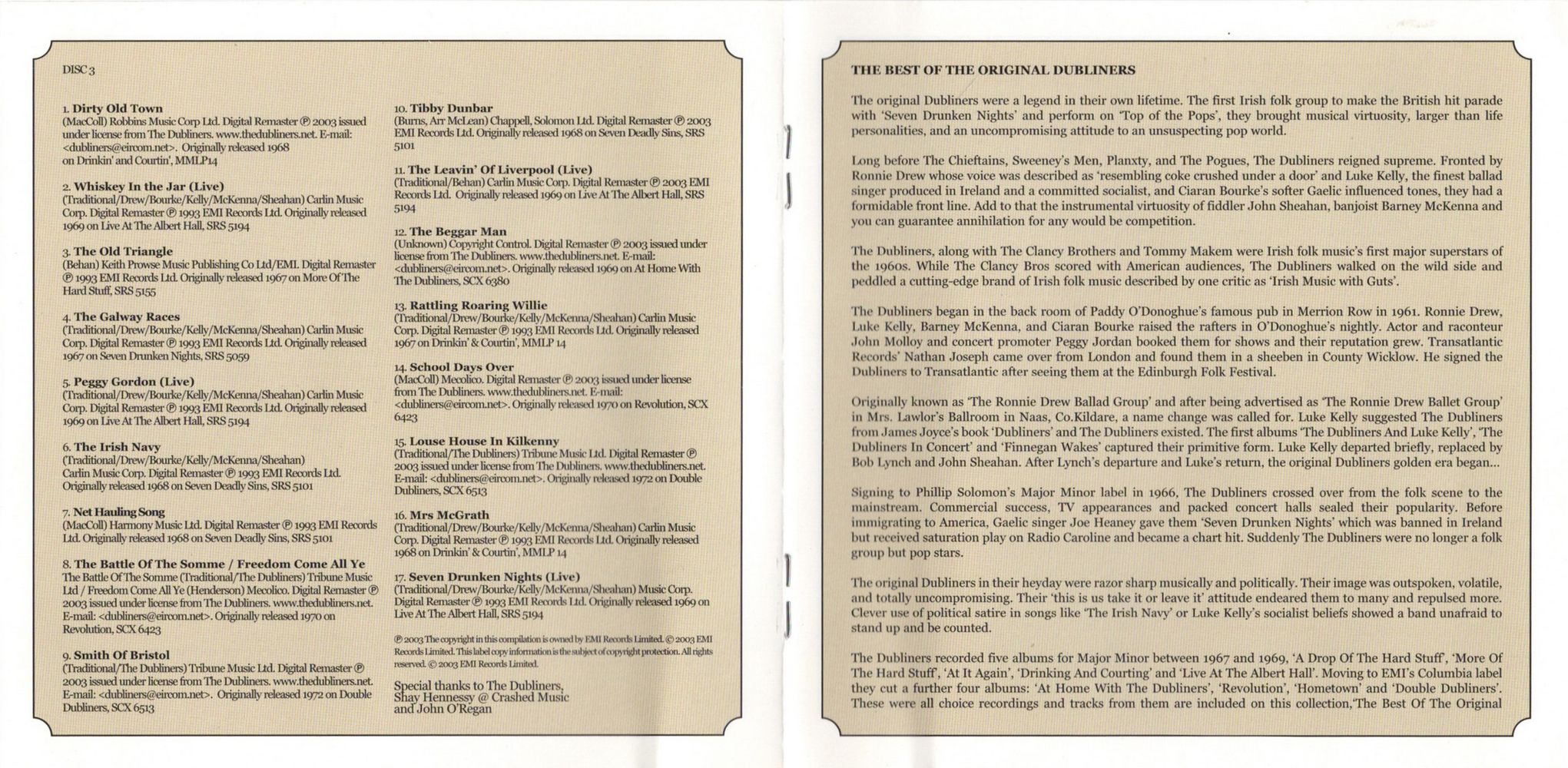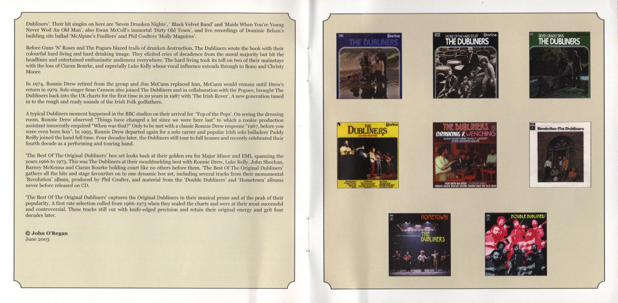 The Dubliners recorded five albums for Major Minor between 1967 and 1969. 'A Drop of The Hard Stuff. 'More of The Hard Stuff. 'At It Again', 'Drinking and Courting' and 'Live at The Albert Hall'. Moving to EMI's Columbia label they cut a further four albums: 'At Home with The Dubliners'. 'Revolution', 'Hometown' and 'Double Dubliners'. These were all choice recordings and tracks from them are included on this collection. The Best of The Original