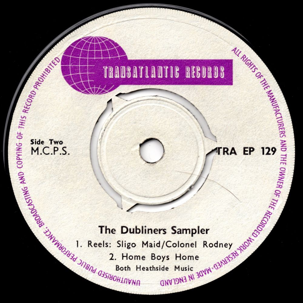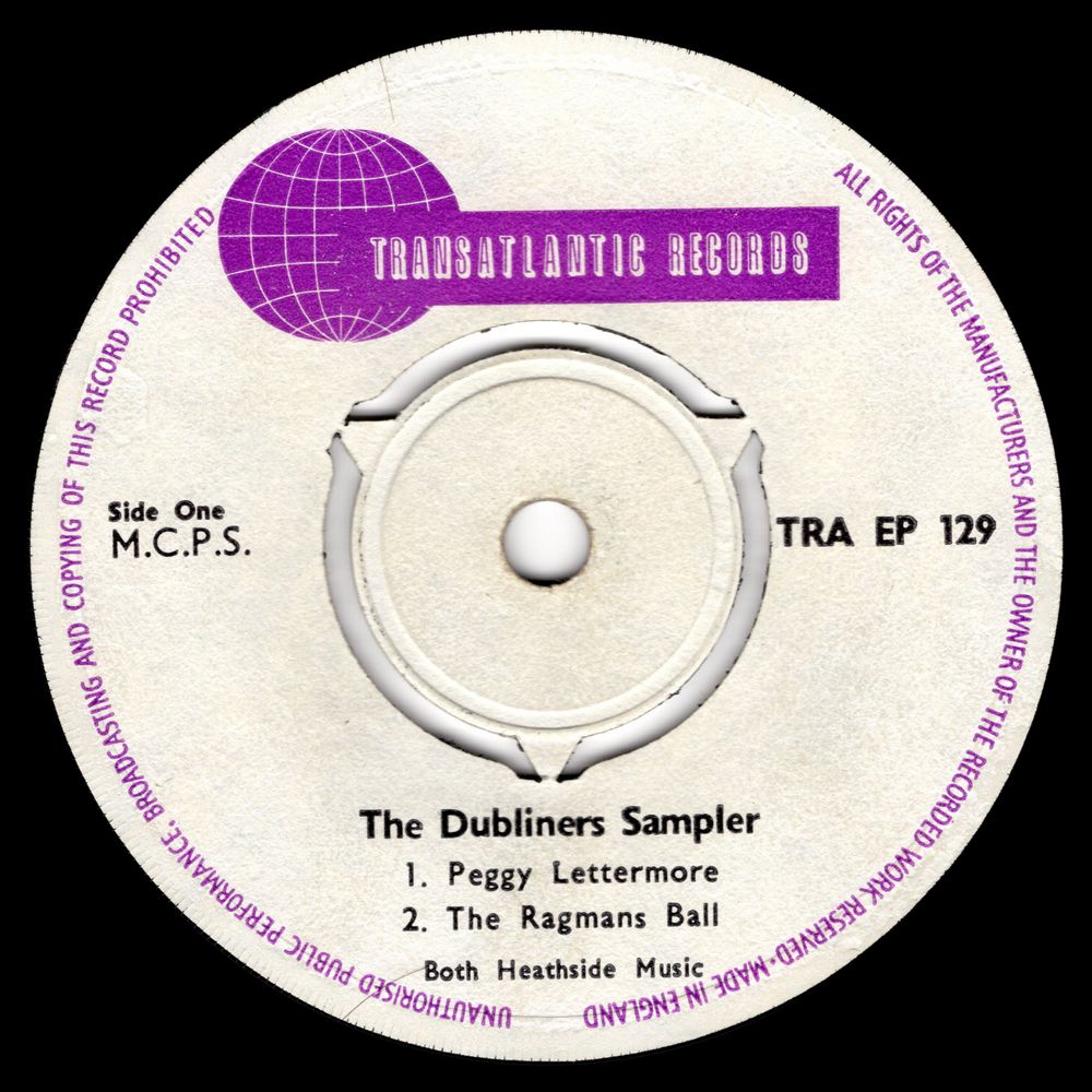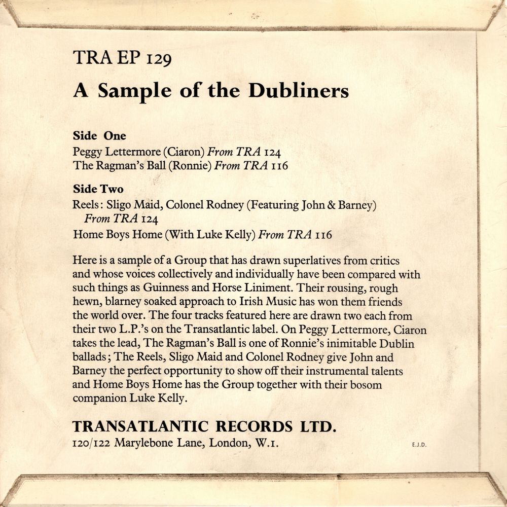 Here is a sample of a Group that has drawn superlatives from critics and whose voices collectively and individually have been compared with such things as Guinness and Horse Liniment. Their rousing, rough hewn, blarney soaked approach to Irish Music has won them friends the world over. The four tracks featured here are drawn two each from their two L.P.'s on the Transatlantic label. On "Peggy Lettermore", Ciaron [sic] takes the lead, "The Ragman's Ball" is one of Ronnie's inimitable Dublin ballads; The Reels, "Sligo Maid" and "Colonel Rodney" give John and Barney the perfect opportunity to show off their instrumental talents and "Home Boys Home" has the Group together with their bosom companion Luke Kelly.