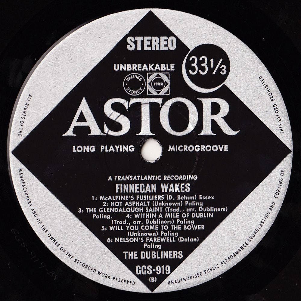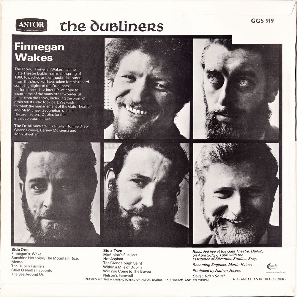 The show, "Finnegan Wakes", at the Gate Theatre Dublin, ran in the spring of 1966 to packed and enthusiastic houses. From the show, we have taken for this record some highlights of the Dubliners' performances. In a later LP we hope to issue some of the many other wonderful items from the show, including the work of other artists who took part. We wish to thank the management of the Gate Theatre and Mr. Michael Geoghehan of Irish Record Factors, Dublin, for their invaluable assistance.