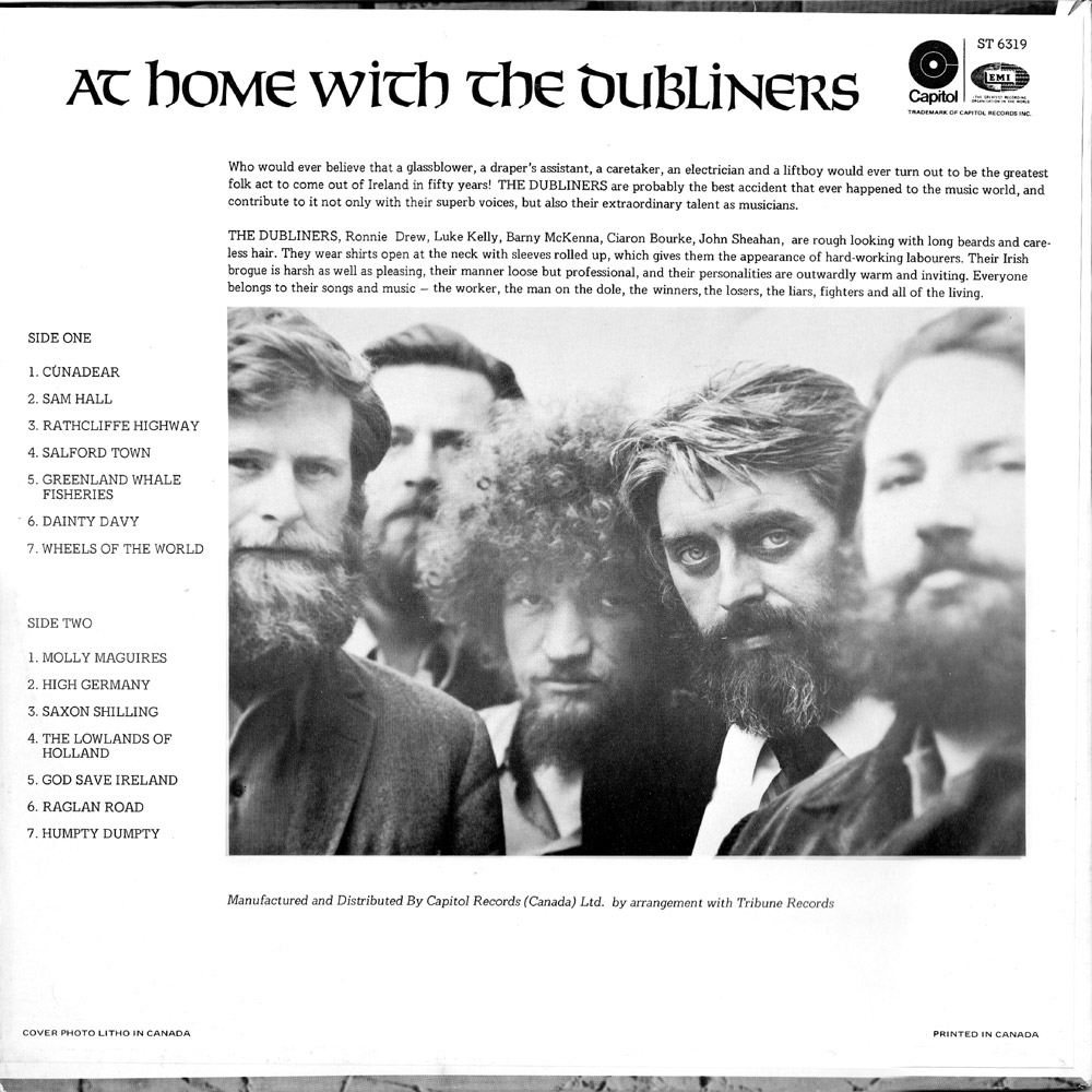 THE DUBLINERS, Ronnie Drew, Luke Kelly, Barny McKenna, Ciaron Bourke, John Sheahan, are rough looking with long beards and careless hair. They wear shirts open at the neck with sleeves rolled up, which gives them the appearance of hard-working labourers. Their Irish brogue is harsh as well as pleasing, their manner loose but professional, and their personalities are outwardly warm and inviting. Everyone belongs to their songs and music — the worker, the man on the dole, the winners, the losers, the liars, fighters and all of the living.