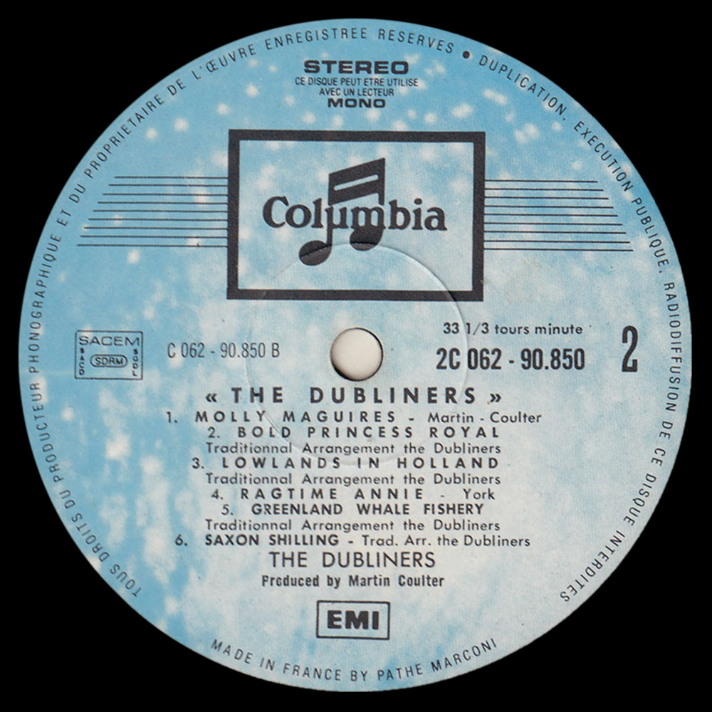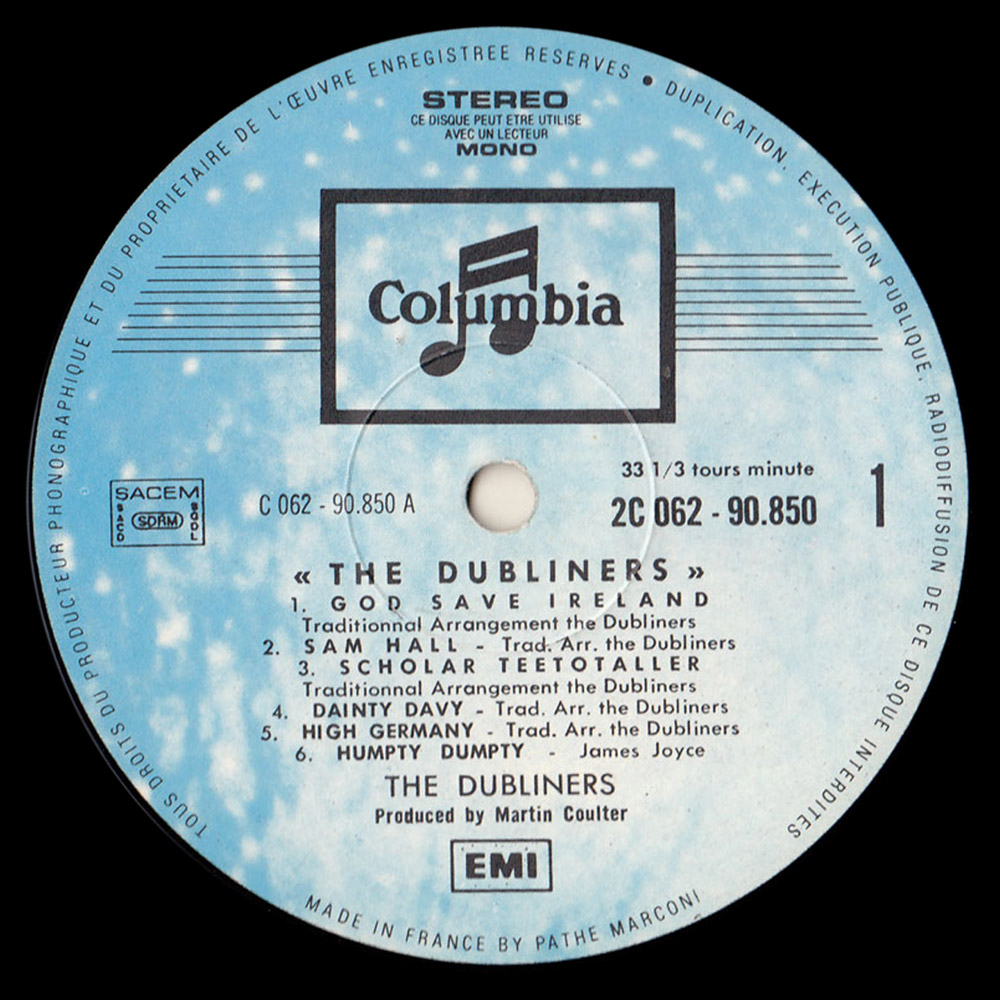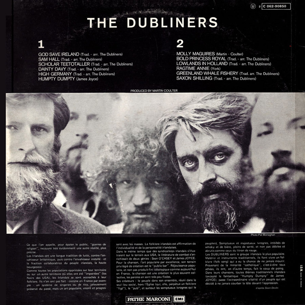 Les DUBLINERS sont le groupe irlandais le plus populaire. Matériel et instruments traditionnels, ils font vivre un folklore (folk song) qui a eu la chance de ne jamais mourir. Provenant de la minorité "catholique", c'est à-dire tous athées, ils ont, en d'autre temps, fait le coup de poing. Dans leurs chansons, toutes thèmes traditionnels irlandais (excepté le fantastique "Humpty Dumpty" de James JOYCE), passe l'extraordinaire vitalité d'un peuple qui est décidé à ne jamais courber la tête devant l'oppression.