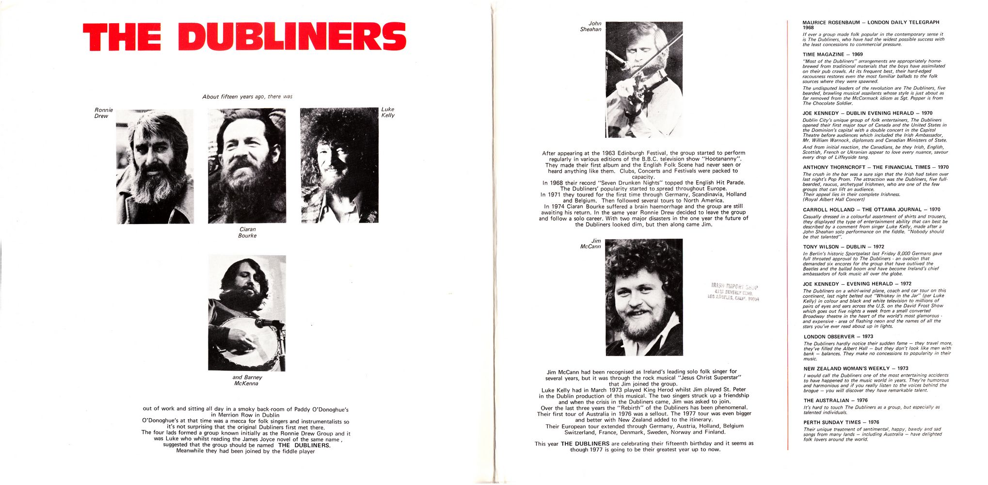 Over the last three years the "Rebirth" of the Dubliners has been phenomenal. Their first tour of Australia in 1976 was a sellout. The 1977 tour was even bigger and better with New Zealand added to the itinerary.