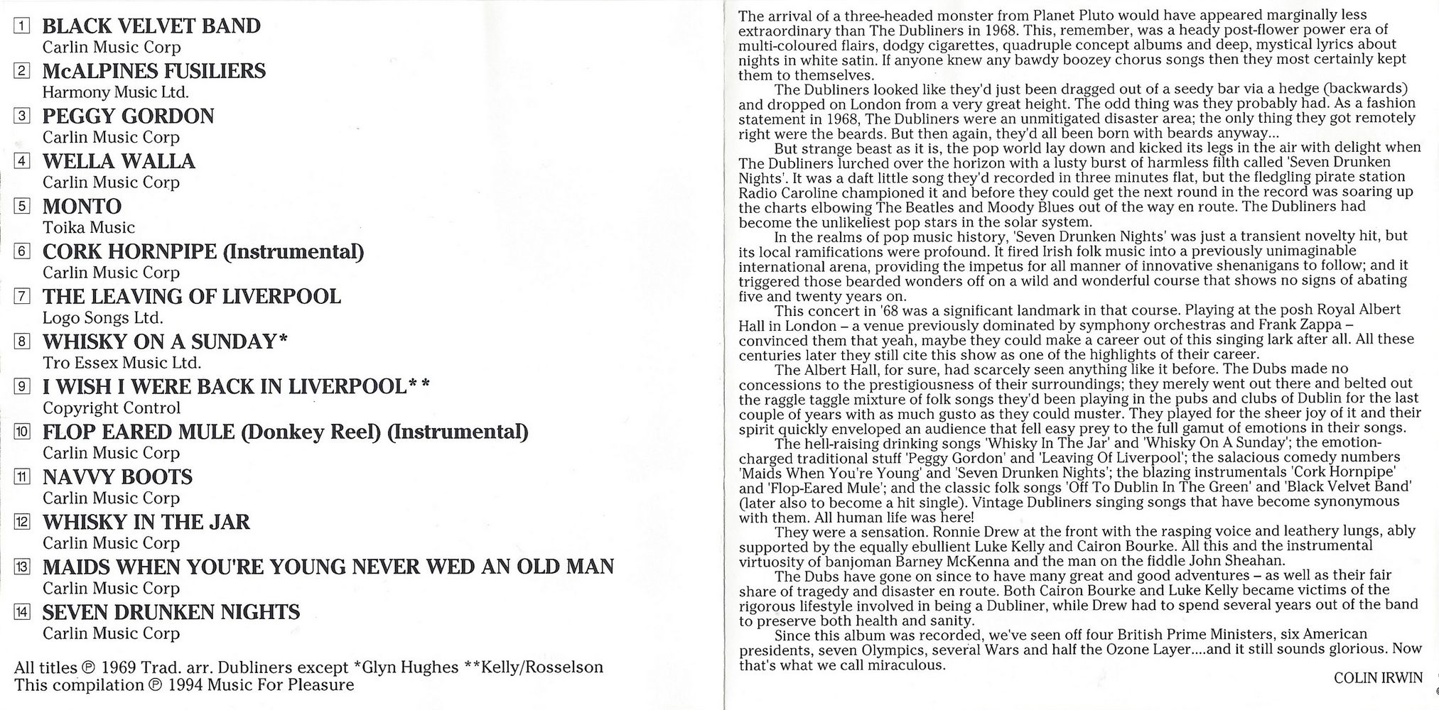 The hell-raising drinking songs 'Whisky In The Jar' and 'Whisky On A Sunday'; the emotion-charged traditional stuff 'Peggy Gordon' and 'Leaving Of Liverpool'; the salacious comedy numbers 'Maids When You're Young' and 'Seven Drunken Nights'; the blazing instrumentals 'Cork Hornpipe' and 'Flop-Eared Mule'; and the classic folk songs 'Off To Dublin In The Green' and 'Black Velvet Band' (later also to become a hit single). Vintage Dubliners singing songs that have become synonymous with them. All human life was here!