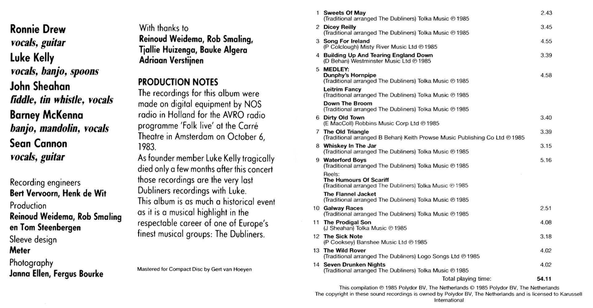 As founder member Luke Kelly tragically died only a few months after this concert those recordings are the very last Dubliners recordings with Luke.