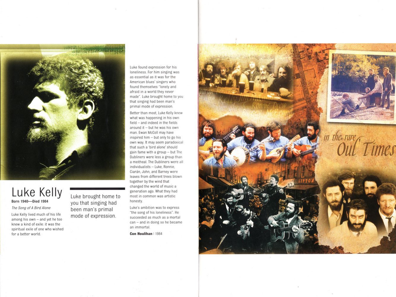 Better than most, Luke Kelly knew what was happening in his own field — and indeed in the fields around it — but he was his own man. Ewan McColl may have inspired him — but only to go his own way. It may seem paradoxical that such a 'bird alone' should gain fame with a group — but The Dubliners were less a group than a meitheal. The Dubliners were all individualists — Luke, Ronnie, Ciarán, John, and Barney were leaves from different trees blown together by the wind that changed the world of music a generation ago. What they had most in common was artistic honesty.
