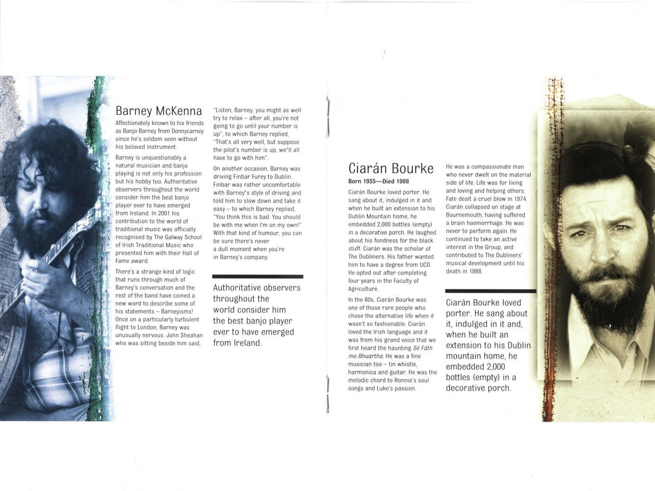 Ciarán Bourke loved porter. He sang about it, indulged in it and when he built an extension to his Dublin Mountain home, he embedded 2,000 bottles (empty) in a decorative porch. He laughed about his fondness for the black stuff. Ciarán was the scholar of The Dubliners. His father wanted him to have a degree from UCD. He opted out after completing four years in the Faculty of Agriculture.